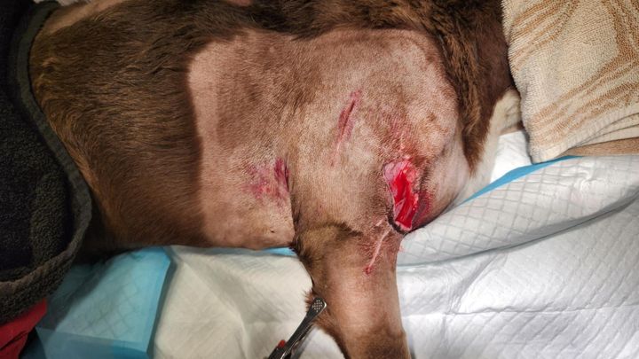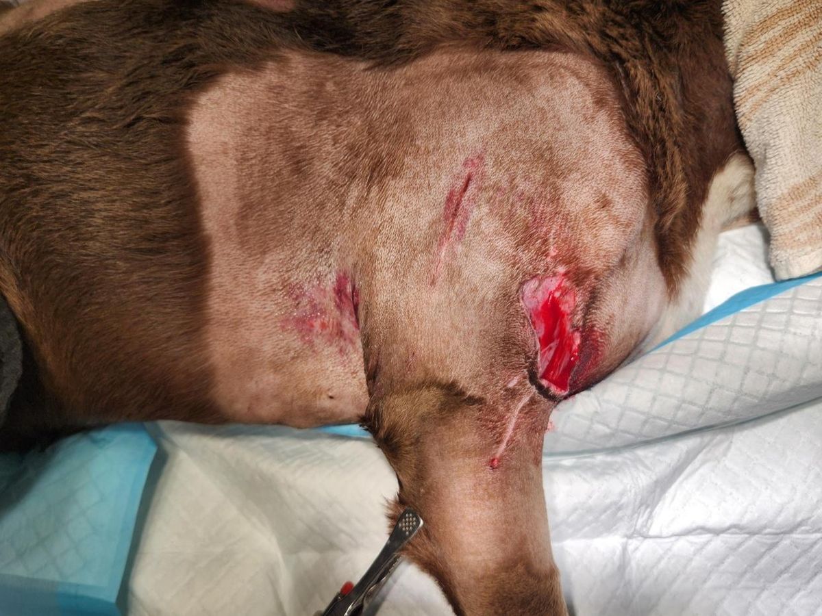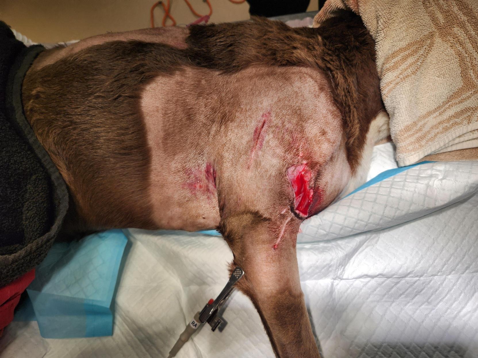 She also needs wound care, rechecks, staple removal, and possibly further surgery to manage tissue loss once infection is controlled.