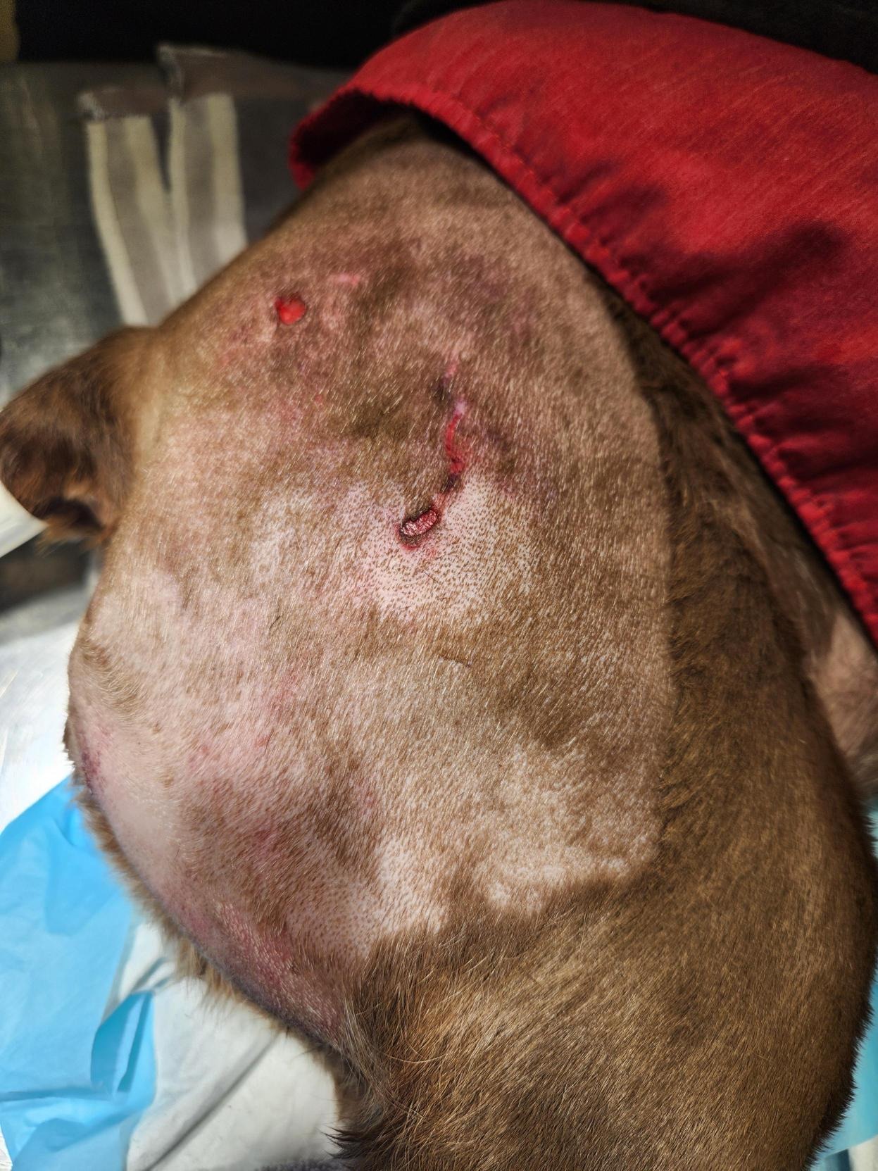 I hoped that first emergency would be enough, but just days later, on September 11th, Chloe spiked a high fever and her wounds began to break down. The drains failed, the infection worsened, and parts of her skin are now dying from the trauma. I had to take her to the VCA Milwaukee Emergency Center, where she received more urgent care, wound flushing, cultures, and a new antibiotic (Baytril).