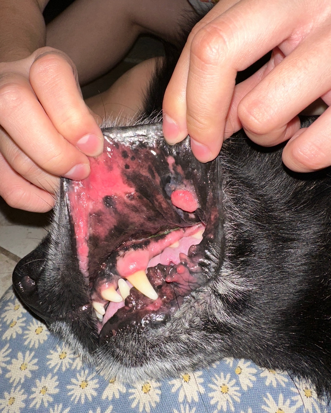 Earlier this year in March, after he was recovering from a leg surgery, I noticed a pink growth on his left cheek while playing with him. My heart sank. After several vet visits, we had the lump partially removed, but the biopsy came back cancerous. Since our regular vet is a general practitioner, they weren’t able to get “full margins” when removing it — meaning not all of the tumor was taken out — and unfortunately, it grew back within weeks.