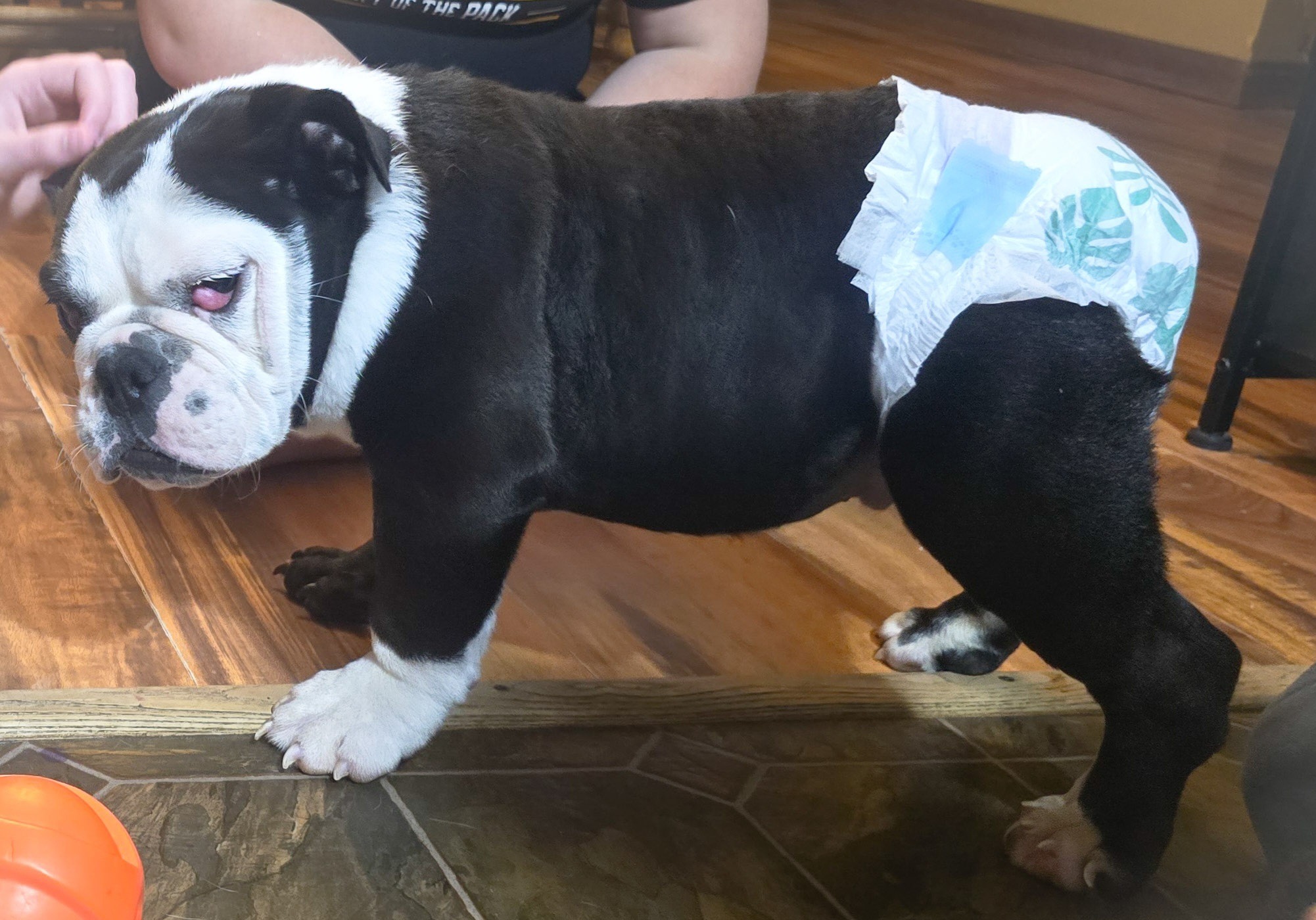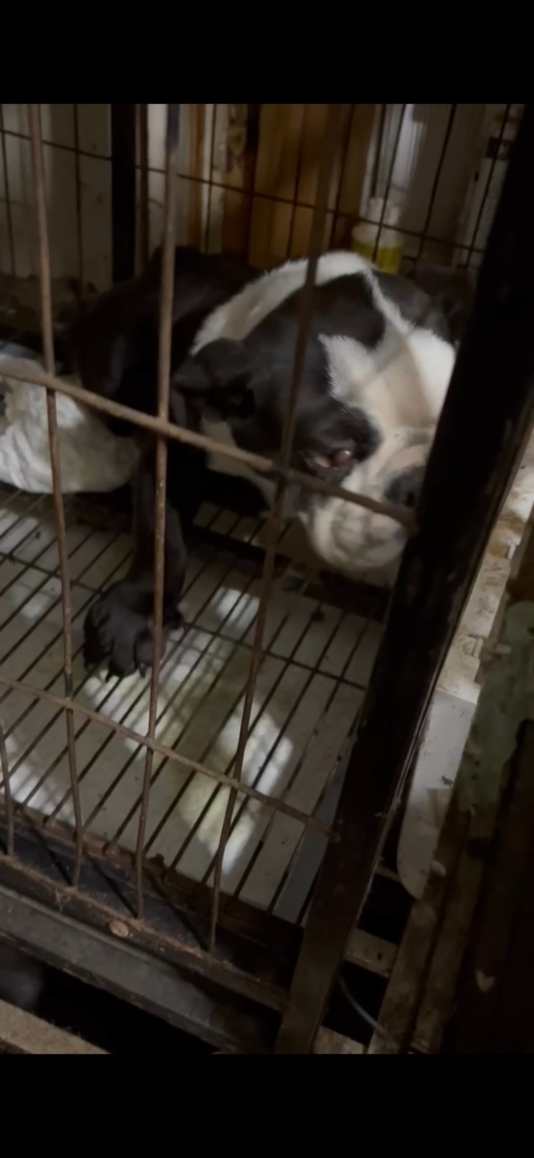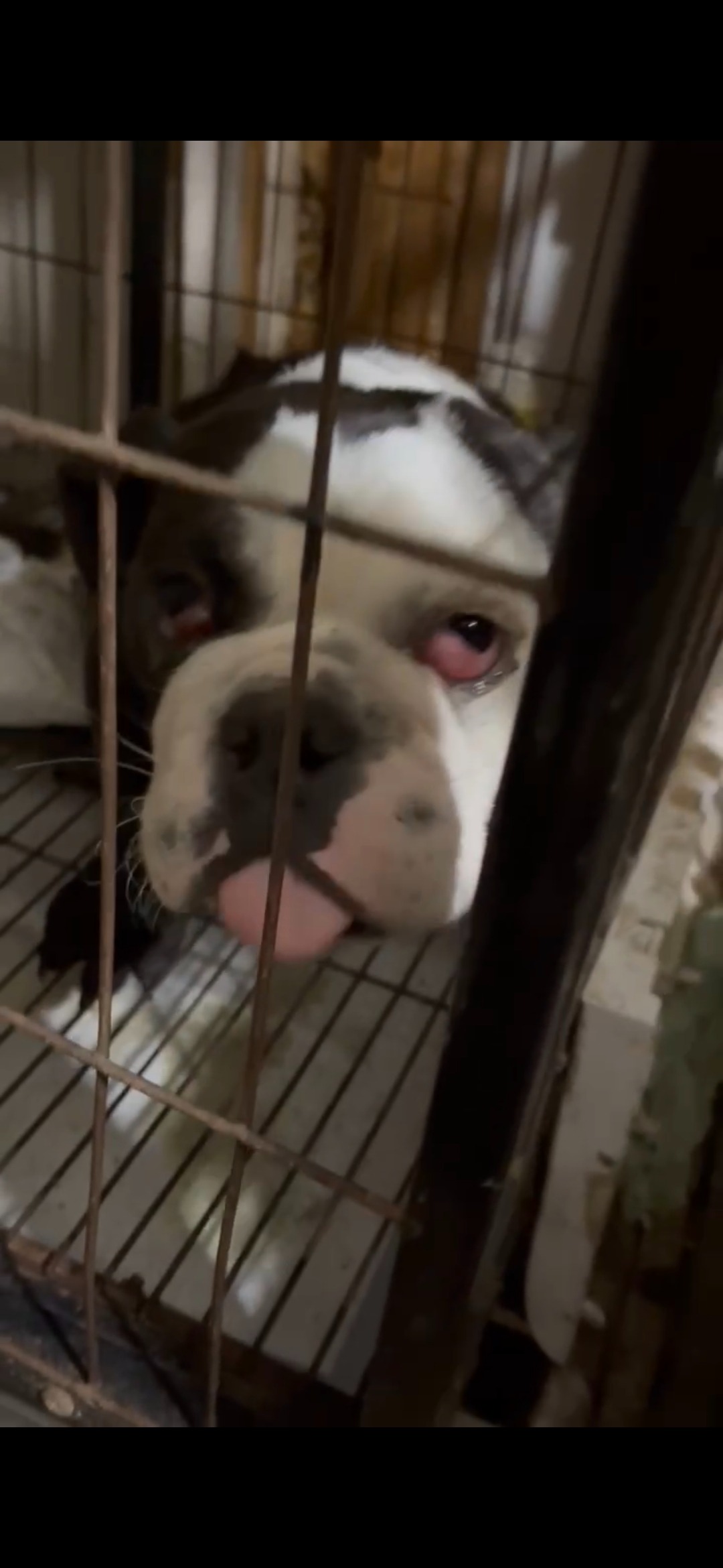 Chunk is a 5-month-old English Bulldog who’s been through something no puppy should. He was kept in a bird cage — not a crate, not a kennel, an actual bird cage — with no room to move or grow. His legs and feet are misshapen, and his back end is weak with almost no muscle tone.