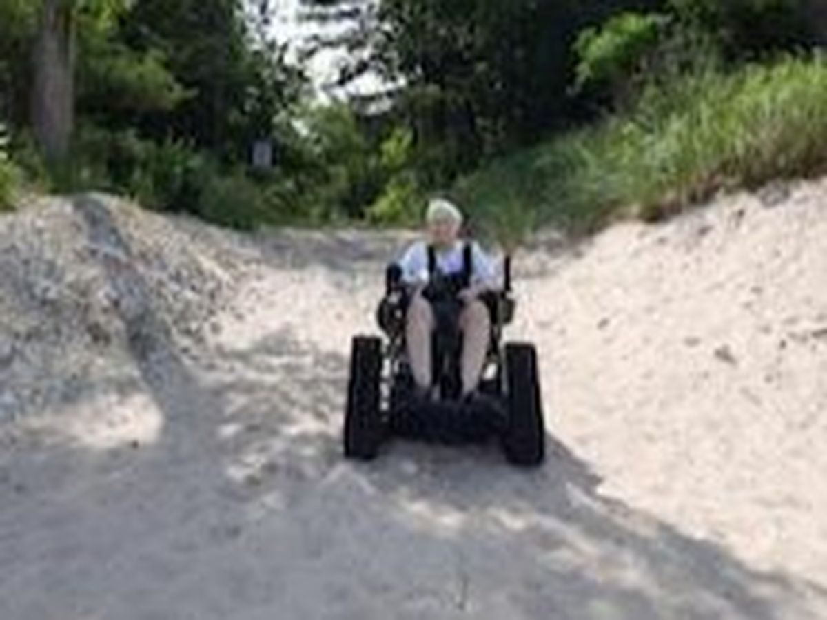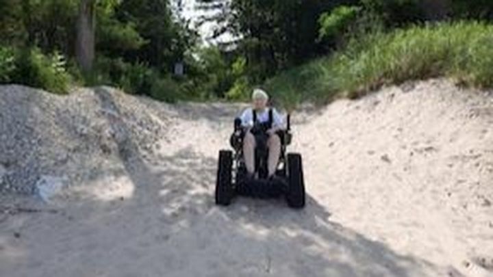 Tragically, Lyme disease and associated illnesses have left her crippled and wheelchair dependent. The challenging wooded terrain around her home makes mobility even more difficult. Although she lives only 4 houses from the Lake Michigan shore, she has not been able to visit or walk on her beloved beach.