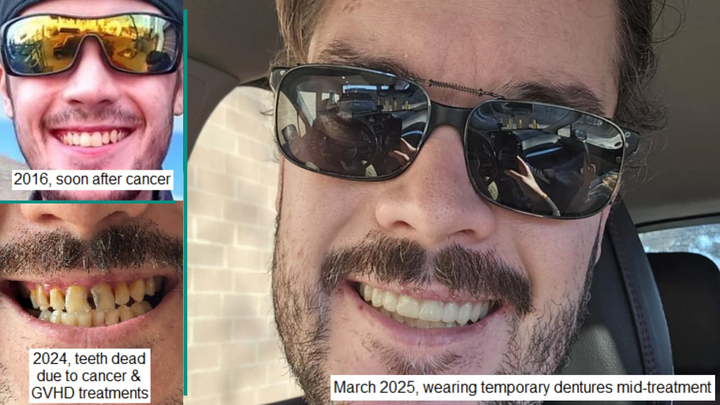 We all know the immediate impact of a cancer diagnosis, but cancer survivors often have to deal with the lingering impact of being a survivor. Such is the case for Cody Cohen, who has been handed way more than any one young person should have to deal with. As a result of Cody's experience with bone marrow cancer (diagnosed just one month before his 18th birthday, in the middle of his senior year in high school) and graft versus host disease, he has unfortunately had many, many nasty chemicals put into his body to kill the cancer and then to fight off the GVHD (a dangerous complication of bone marrow transplant). These chemicals have caused a multitude of issues for Cody, a major one being the death of his teeth. On March 12, nearly 12 years after his first bone marrow transplant in 2023, Cody underwent major oral surgery in which the oral surgeon removed all of his top teeth for a "full arch denture" — basically a full top jaw of implants, as well as having four individual implants placed in the bottom. (In two previous minor oral surgeries, most of his bottom teeth were removed and bone grafts were placed to provide a foundation for implants.) For the privilege of having teeth that allow him to eat what he wants to eat and what he needs to eat to get proper nutrition, Cody will need to pay about $37,000, as this surgery is not covered by private, for-profit health insurance.