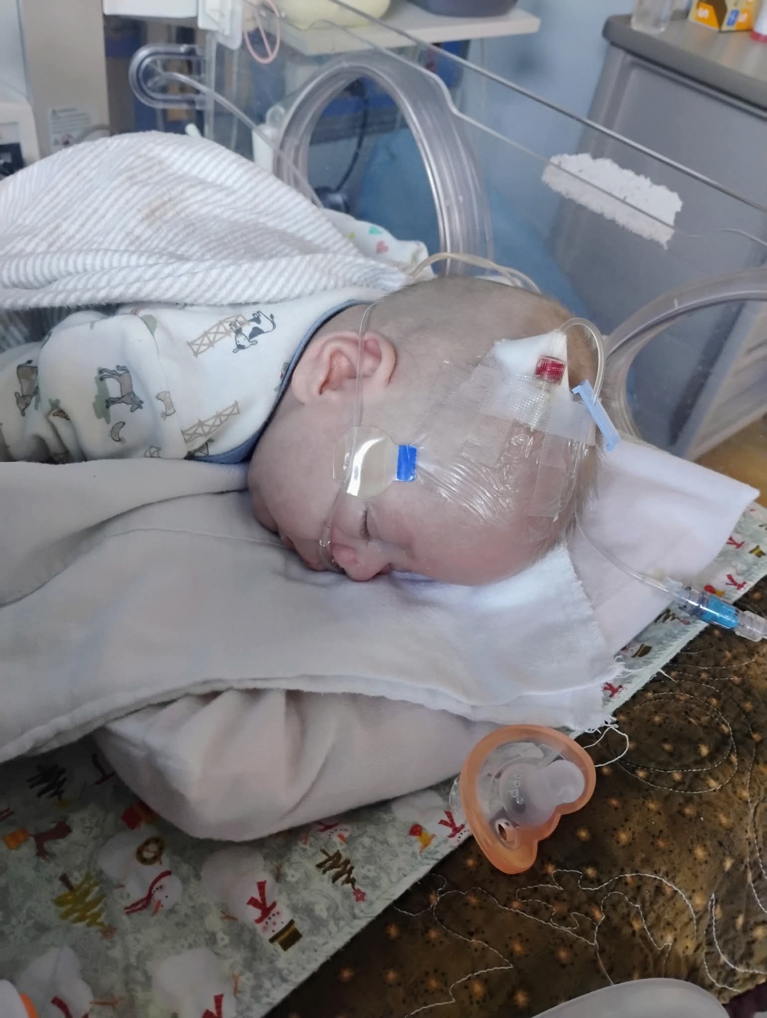 Ryker has remained in the NICU since the day he was born and has faced overwhelming medical challenges. He was born with fragile bones that led to leg fractures, club feet, and may be blind in one eye. For months, he experienced multiple bradycardia episodes every night, only beginning to improve about three weeks ago. He required oxygen around the clock until just two weeks ago. Ryker also struggles with secretions that must be suctioned to prevent choking, and he recently underwent surgery to place a G-tube so he can receive proper nutrition and continue to grow. Despite everything his little body has endured, Ryker continues to fight every single day.