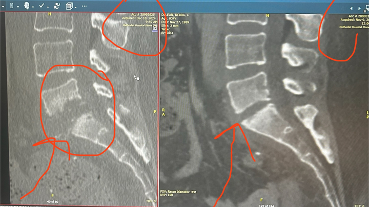 After her hospital stay and release in August 2024, she started having severe lower back pain. After multiple hospital ERs, standalone ERs, and urgent cares that kept sending her home stating it was just inflammation due to the surgery, we decided to go once again to the ER on November 9th as she was in such severe pain. They were again going to send her home due to inflammation around the spine, stating it was due to the surgery (back in August).