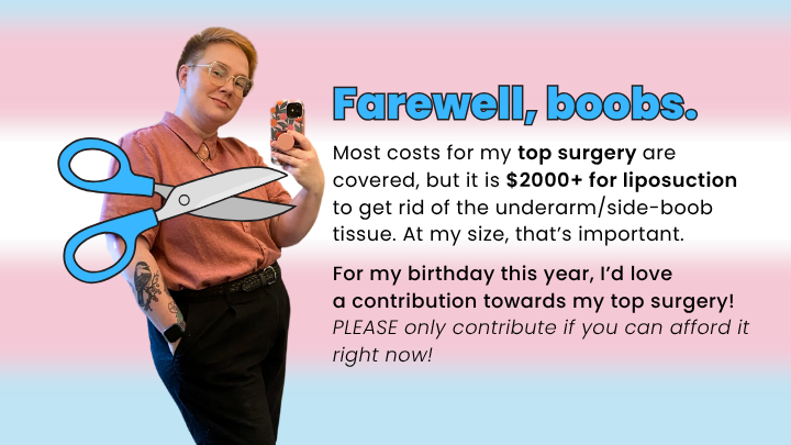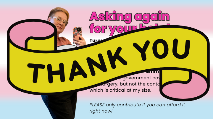 It means the world to have a community that supports my gender affirmation journey. Please only contribute if you can afford it right now! Thank you to everyone who supports me in so many ways.