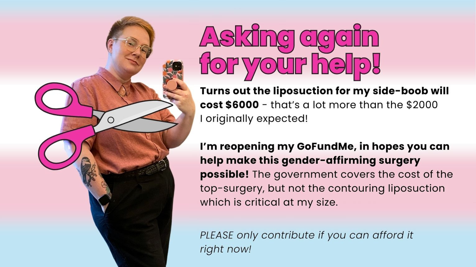 My top surgery is in just 10 days, so imagine my surprise when the hospital told me that lateral torso liposuction would be $6000, not the $2000 I expected when I opened this GoFundMe in June! They had told me liposuction costs $2000+, and I interpreted that as the type of liposuction I need started at that price. Unfortunately, I was wrong!