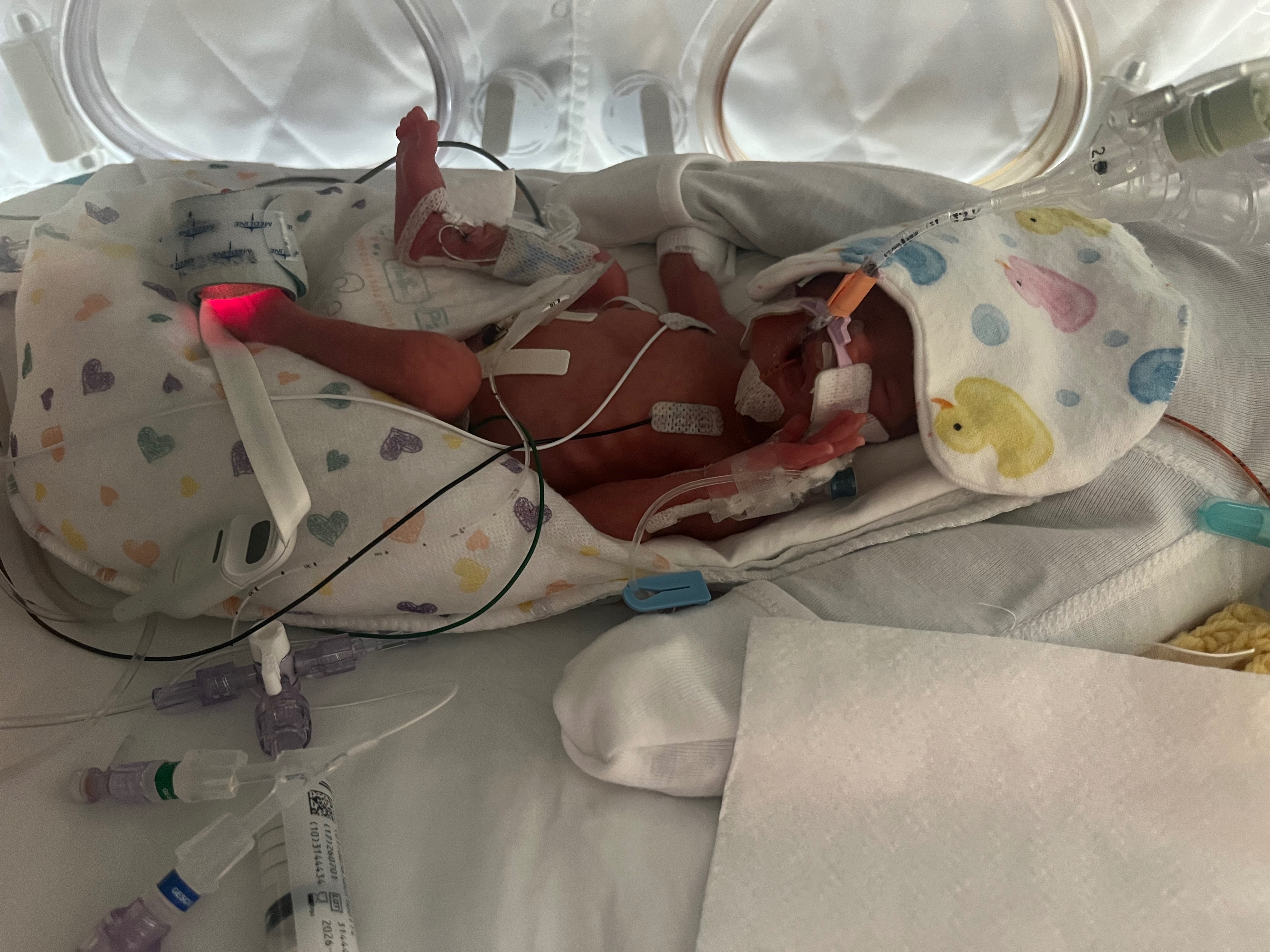 By Sunday morning, our lives had spiraled into a nightmare. My blood pressure skyrocketed to 210/120, and I was rushed to the hospital. I went through CT scans, MRIs, and was given magnesium sulfate urgently to keep me from having a stroke. They also gave me betamethasone in hopes that our baby’s tiny lungs would have the strength to survive what was coming. That night, the doctors made the decision we feared with all our hearts: an emergency C-section due to a possible occult abruption. Everything happened so fast… I had never felt so scared, vulnerable, so powerless, so completely out of control. Nothing can prepare you for seeing your baby connected to a ventilator, surrounded by tubes and wires, lying inside an incubator—so small, so fragile… and not being able to hold her. The helplessness shatters you. The silence in the room is heavy, broken only by the beeping of the monitors which are constant reminders of how delicate, how uncertain, everything is.