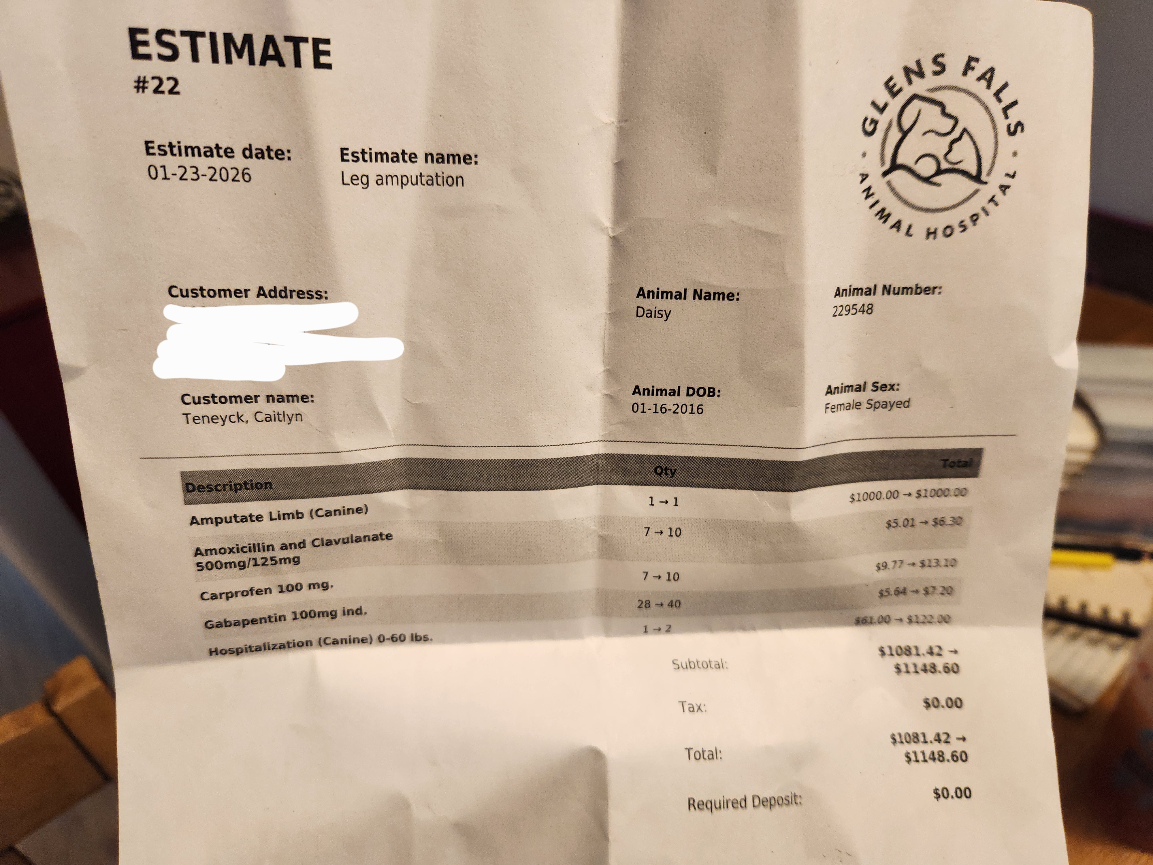 Daisy’s amputation and aftercare costs at Glens Falls Animal Hospital for comfort