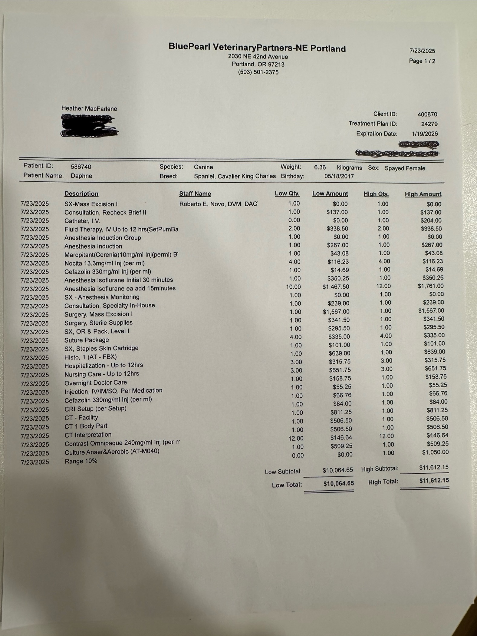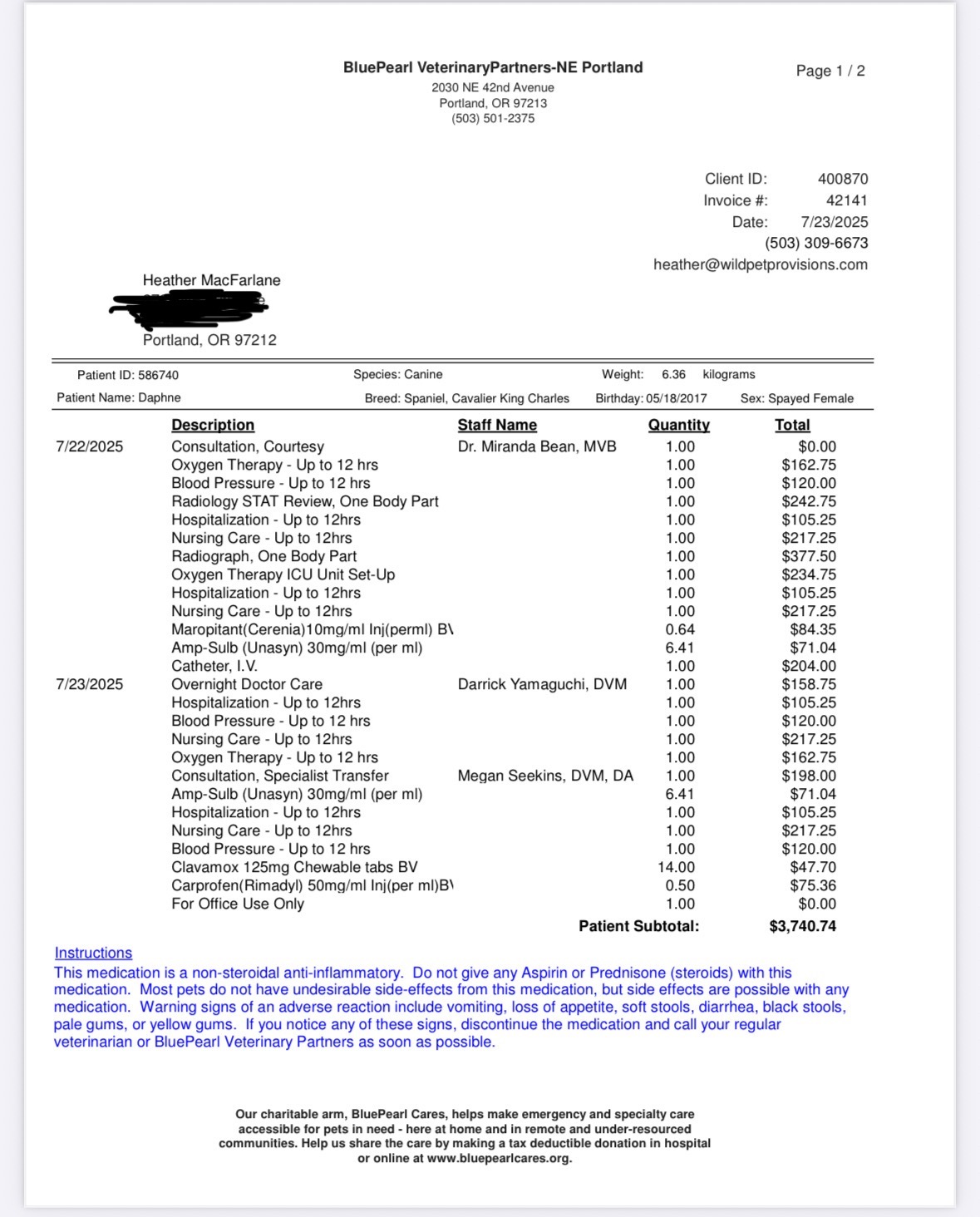 - 7/22–7/23 hospitalization at Blue Pearl (NE): $3,740.74