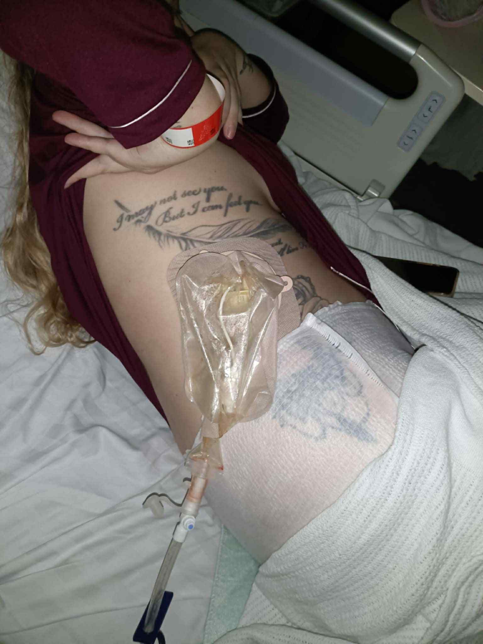 A few hours after recovery, they took Darion away for a procedure where they fitted a Nephrostomy bag into Darion’s right kidney, which would come out of her back, and a tube would run down her leg into another bag.