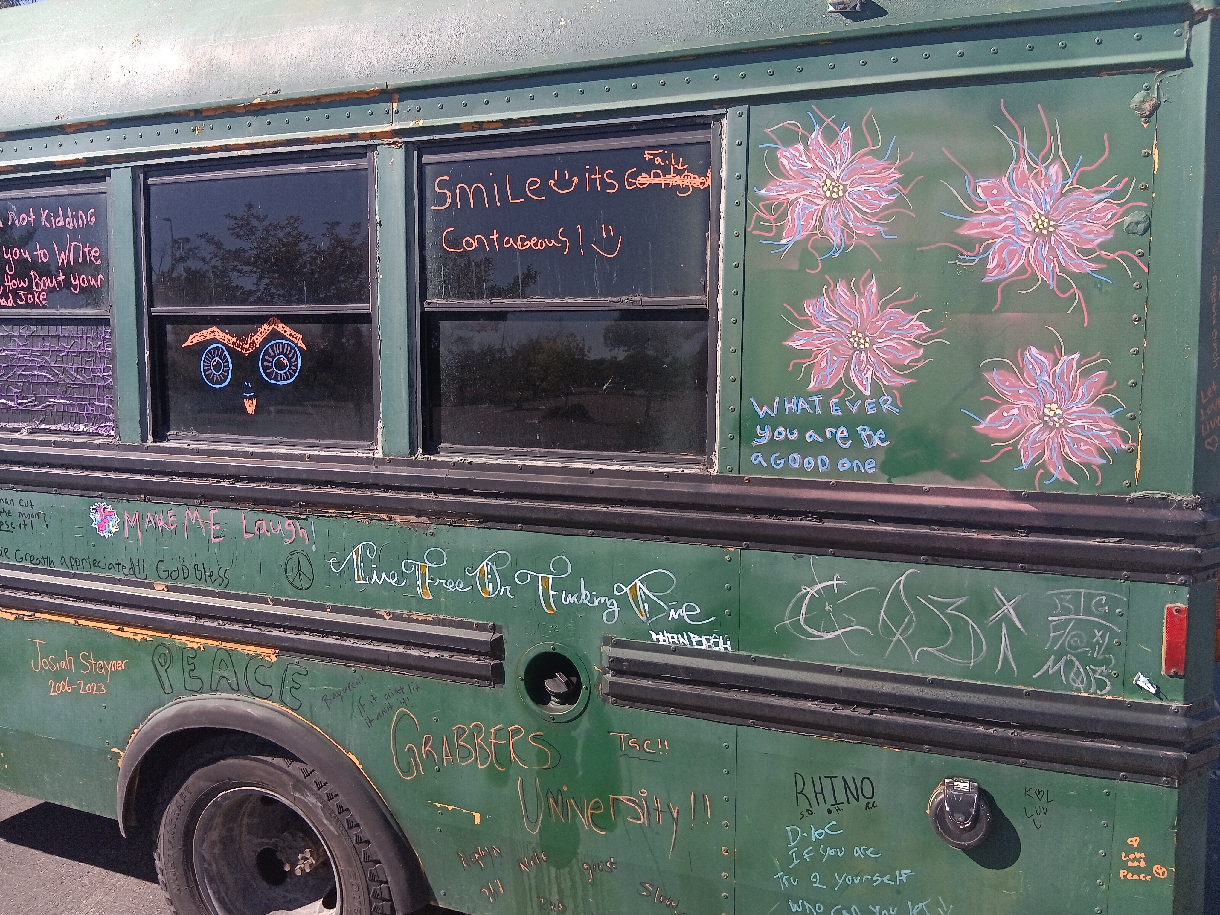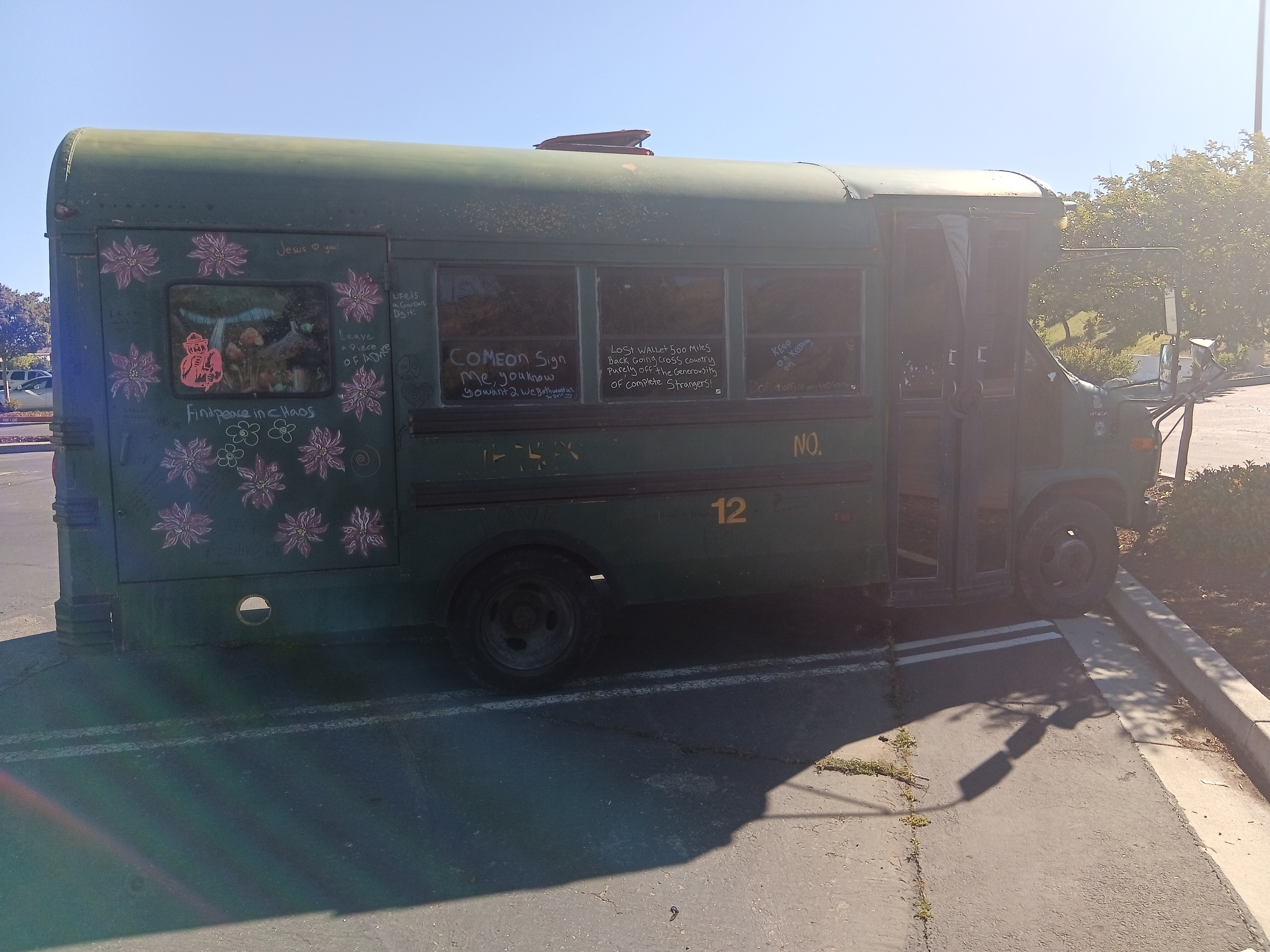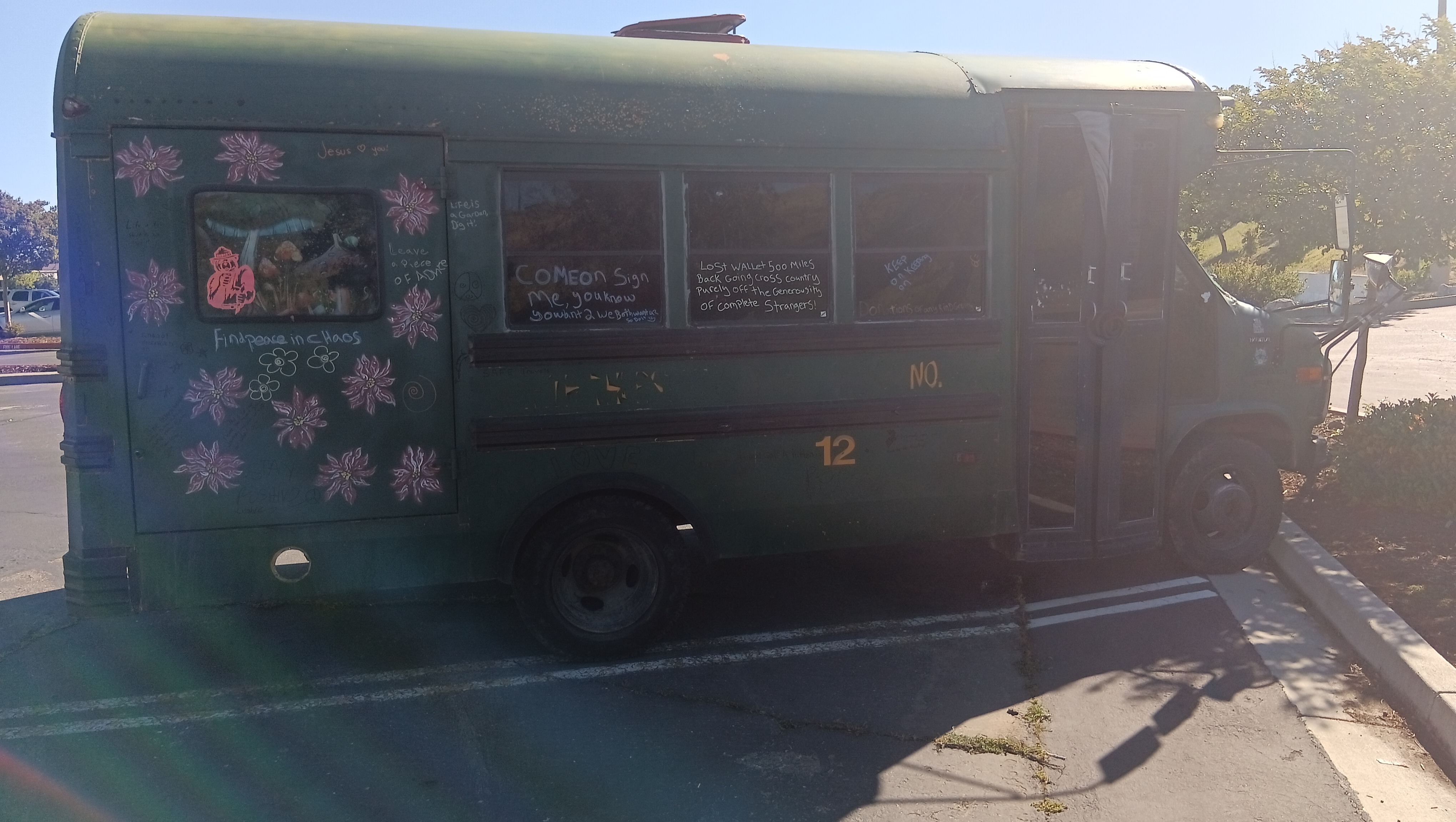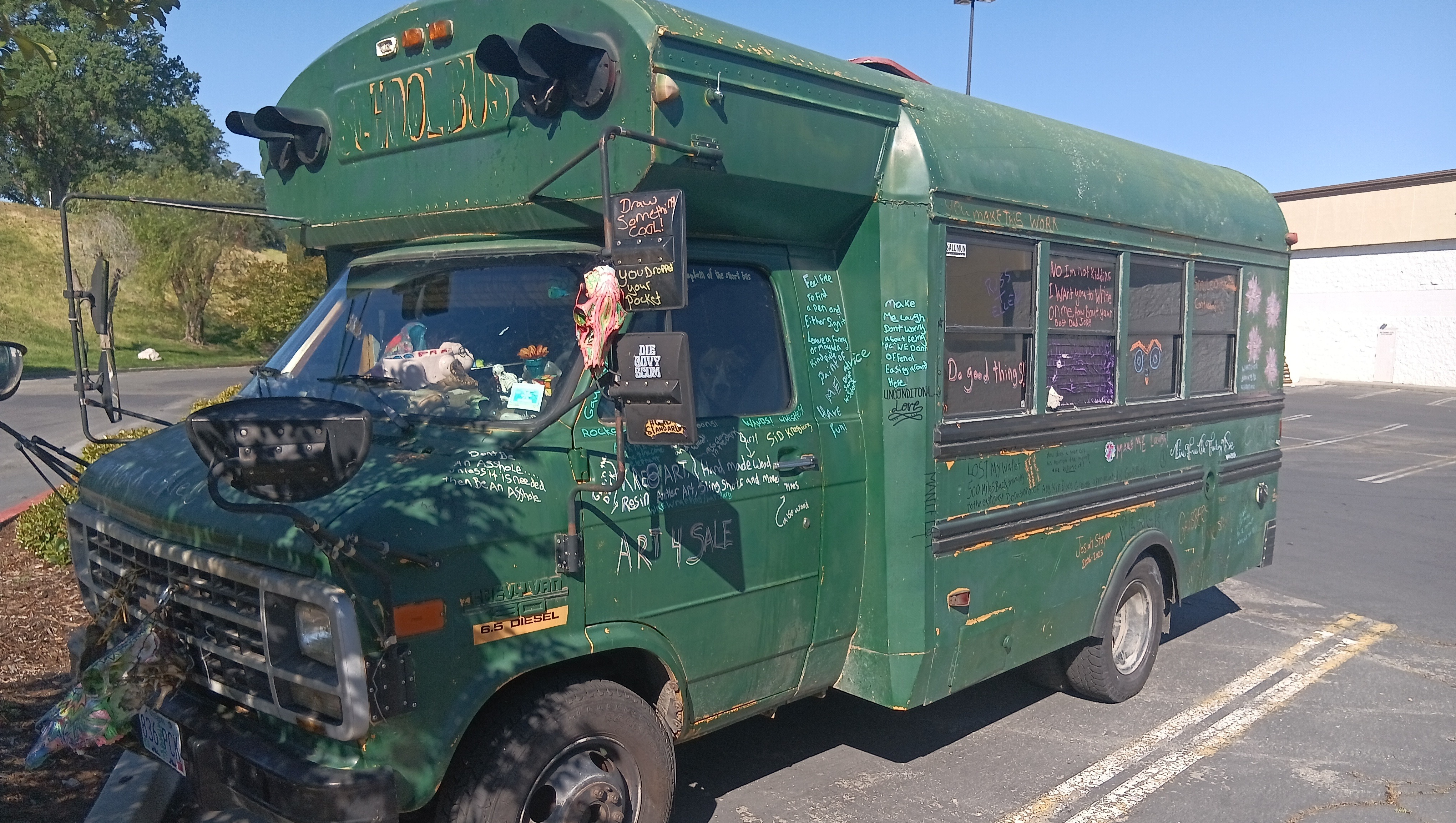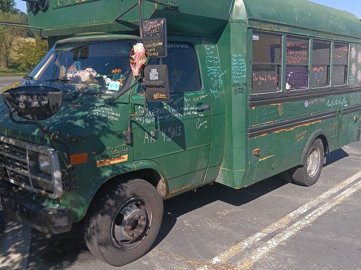 his last year for my adventure and stocked up on artwork to possibly sell along the way (I've sold nothing nobody wants to buy art from a dude in a short bus bo matter how good it is) I went from Mount hood to John day in eastern oregon had all my cash in my wallet as there aren't any of my bank out of state and guess what happened I lost it my entire fire earnings gone wallet gone and at the point I discovered it gone I was already 300 miles away so I decided I could let it make or break me so I continued on now completely broke in a diesel short bus that gets about 10 miles to the gallon also my phone broke when I left eastern oregon in February so I continued on holding up a sign begging for change, now when I left oregon I didn't know diesel was going to be almost 8 dollars a gallon in california making traveling slow I eventually got to reno. Also the original goal was Florida but in reno I ended up becoming fortunate enough to get a new phone at which point my best friend who lives in astoria got ahold of me, him and his wife and their sone also live on wheels he pleased with me (more like ordered me) to turn my bus around go to astoria and make enough to try again now at this point I'm almost a month into this slow moving adventure so I decided he's right but being in Reno I still wanted to see some stuff mainly lake Tahoe so I slowly made my way to Tahoe then Sacramento which brings me to my current location of Redding where I'm stranded, holding up a sign has done no good here, I'm assuming due to all the homeless people, also I don't really use cards mainly cash or my credit union back home my id is gone my EBT card was good until it broke and I get get a replacement in a different state so a lot of the little I've been getting has been going to put something in my stomach along with hydrate me and make sure my pups are taken care of but I'm at a loss I've tried doing good things for people and places everywhere I go such as help out homeless with what I can share clean up parking lots it's been a lot of parking lot to parking lot having security kick me out running out of fuel which makes my batteries die but I guess I'm asking for some help from some decent people Im trying to make it to Astoria from Redding by my best friends birthday the 12th but almost 8 dollars a gallon and ten miles to the gallon I don't see that happening without your help I haven't had a hot shower since February 4rh haven't been able to do laundry just as long, when your literally living off a couple bucks (maybe) a day those things become a luxury I've been bathing and doing small amounts of laundry either in bathrooms or rivers rivers are colder but I actually prefer them to the public restroom sink shower I'm hungry Im just trying to make it home and I still have over 500 miles left to go which is about 50 to 55 gallons of diesel I need to get food for myself, my dogs are always taken care of first and they are fine on food I have two bags still which should get us home anywho thanks for all your help or not help even if you just read this and moved on I appreciate you taking the time to read this I am desperate to get back home safe to save and try again but next time not alone but with others, the road is a dangerous place to go alone especially when your going from parking lot to parking lot please help me and my pups and home make it home it has been hard doing it with the sign not only are you not guaranteed any money is made but having to stand there with a sign not only makes one feel disgusted with oneself but also ashamed foe having to do it and a lot more people give you scowls and looks of disgust over actually helping you out (Tesla drivers are the absolute worst) I've been told I should end my own life that I'm scum and this is coming from people I have literally risked my life year after year to try and protect everything they own idk though I try to not let them get me down the world is beautiful and there are wonderful people in it thanks for your help God bless and have a wonderful rest of your day also anyone who helps me move along gets to have either their names or really whatever they want drawn on the bus almost all the dad jokes signatures doodles and pieces of wise words of advice are all from people I've met along this adventure and I'll keep to it on here too everyone who donates will have their spot on the bus to either have their name or saying or joke written down on it in paint pen okay thanks guys also I do have lots of artwork for sale but that's not for here thank you again pece and love people also I need fluids not just fuel I need brake fluid transmission fluid power steering fluid it about needs an oil change but I'll try and make it home before for the oil change thanks again! Oh yeah and the elephant head in the pictures, that's a pine cone... I told you my work isn't terrible lol