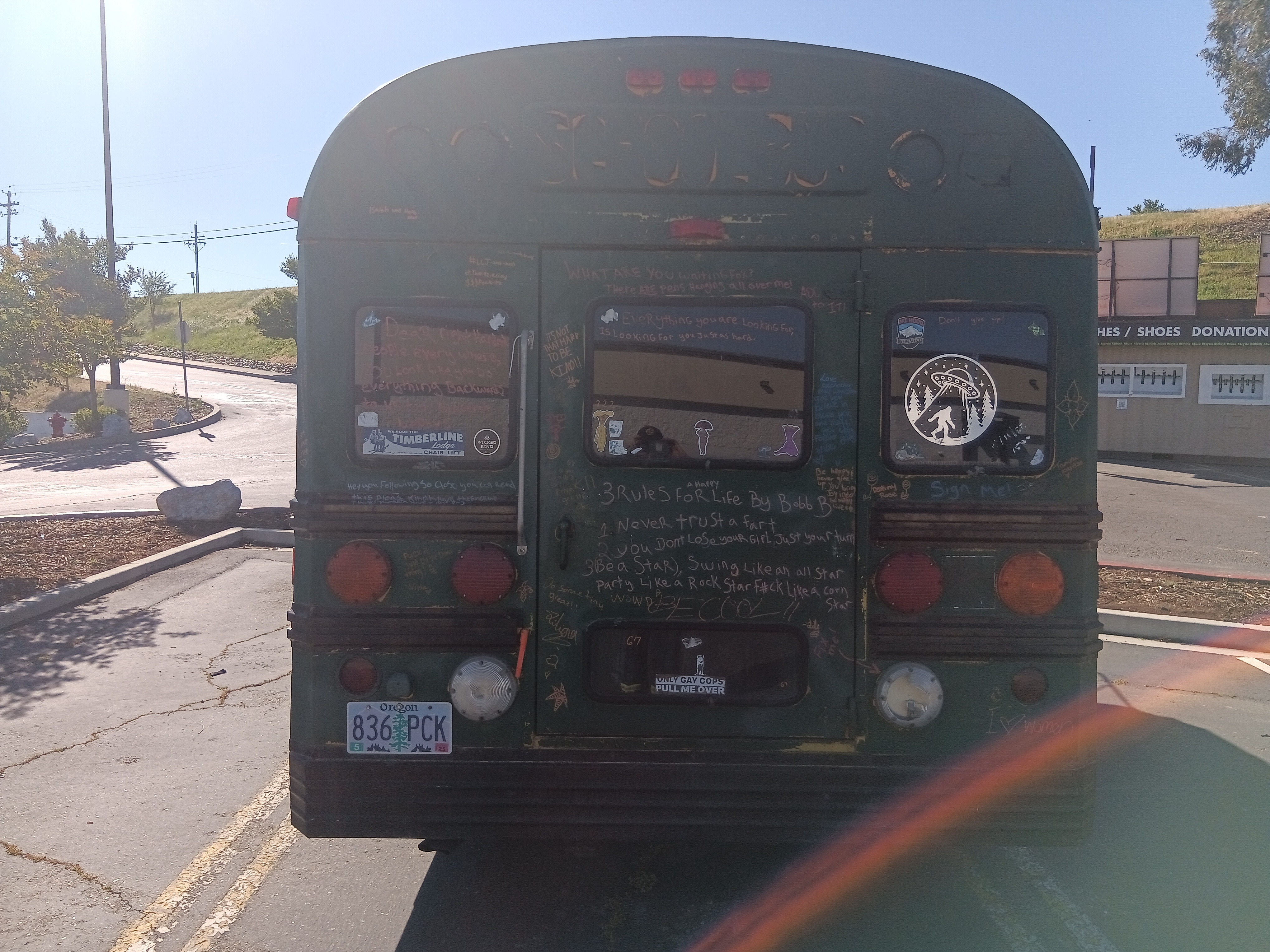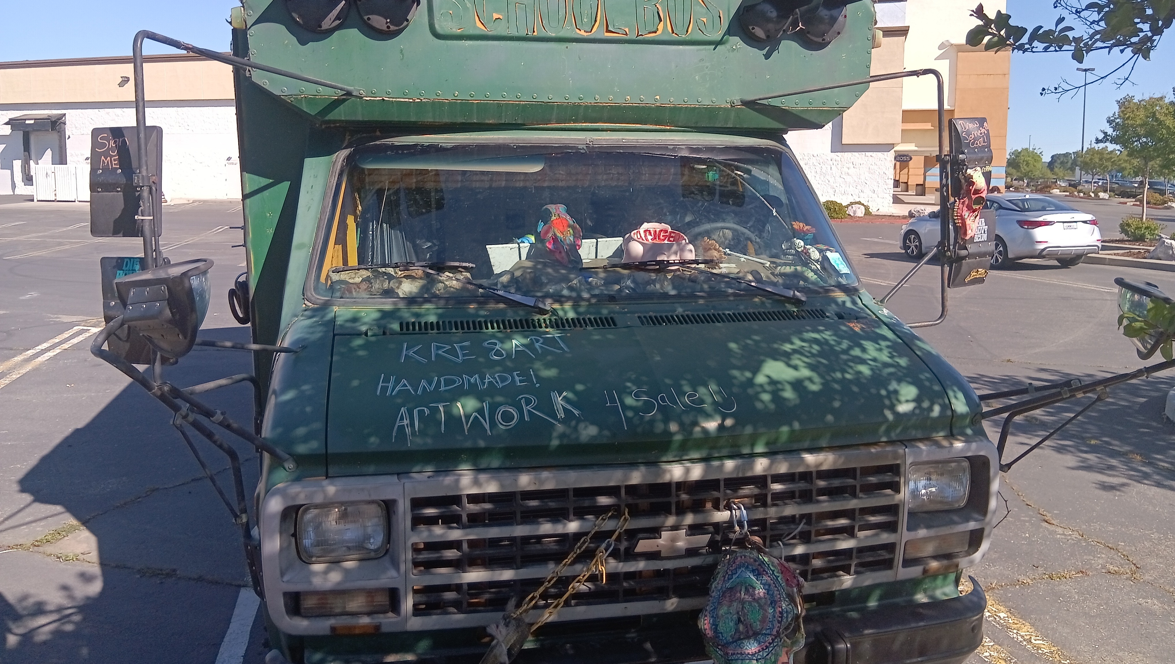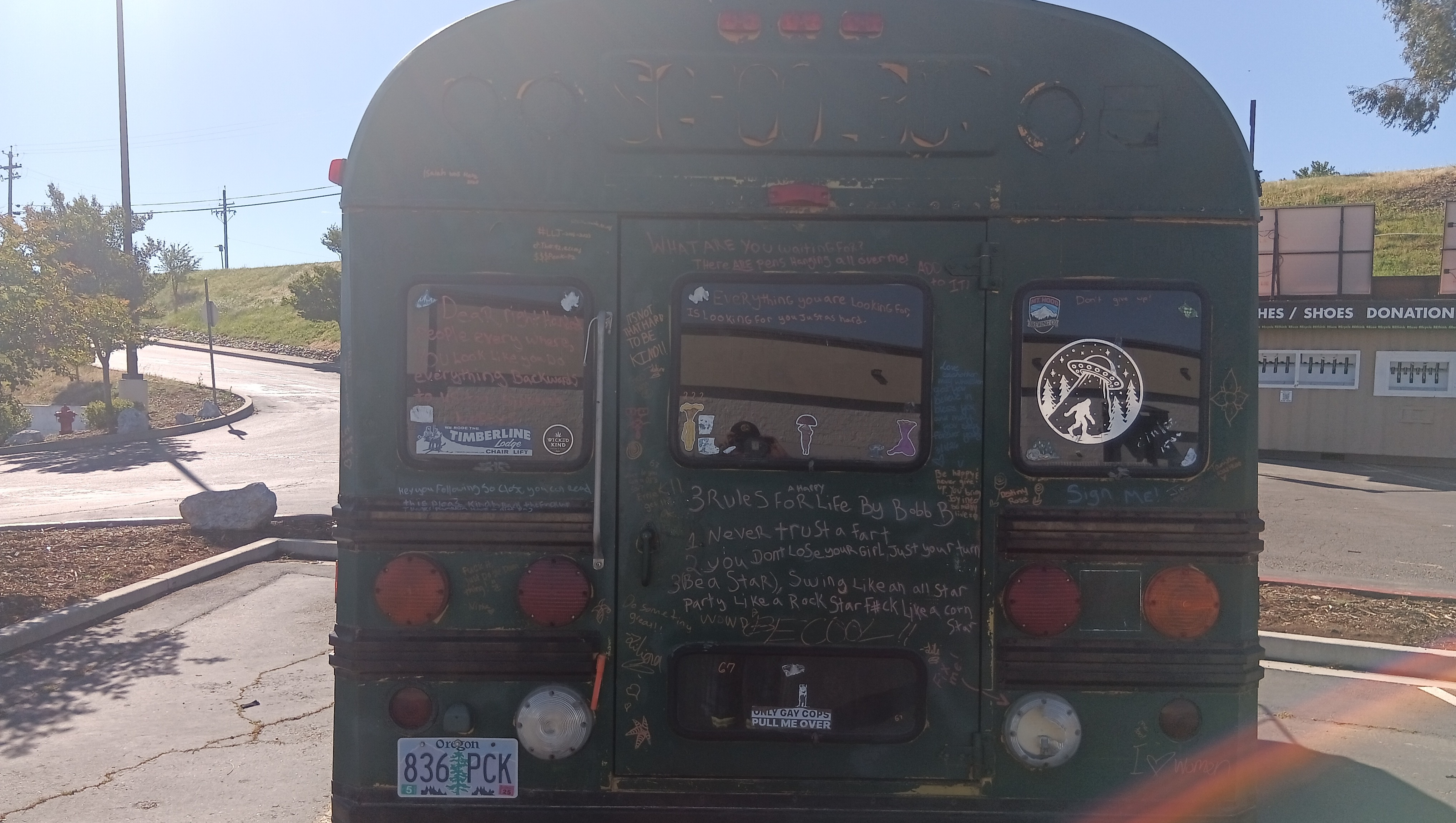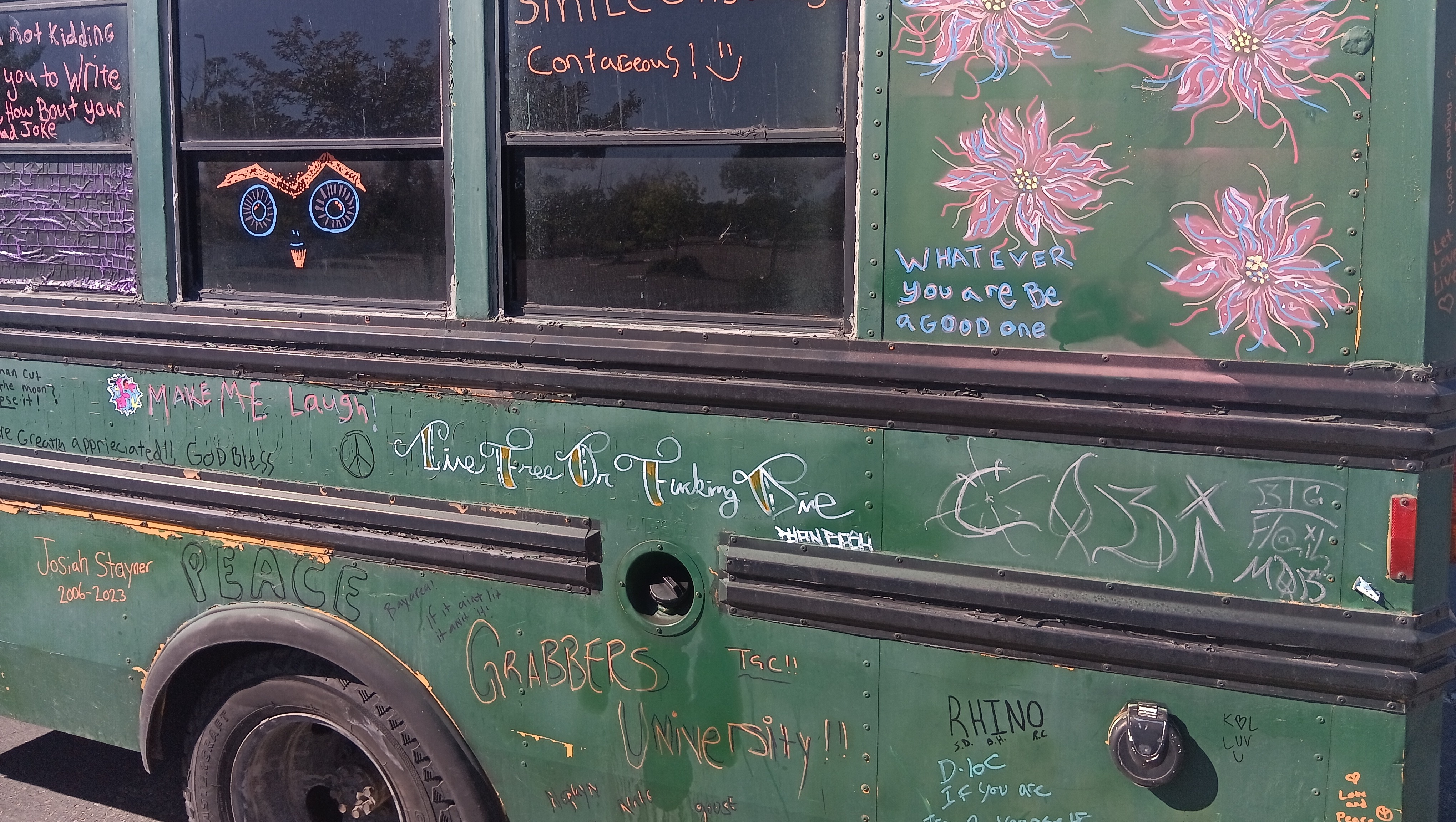 his last year for my adventure and stocked up on artwork to possibly sell along the way (I've sold nothing nobody wants to buy art from a dude in a short bus bo matter how good it is) I went from Mount hood to John day in eastern oregon had all my cash in my wallet as there aren't any of my bank out of state and guess what happened I lost it my entire fire earnings gone wallet gone and at the point I discovered it gone I was already 300 miles away so I decided I could let it make or break me so I continued on now completely broke in a diesel short bus that gets about 10 miles to the gallon also my phone broke when I left eastern oregon in February so I continued on holding up a sign begging for change, now when I left oregon I didn't know diesel was going to be almost 8 dollars a gallon in california making traveling slow I eventually got to reno. Also the original goal was Florida but in reno I ended up becoming fortunate enough to get a new phone at which point my best friend who lives in astoria got ahold of me, him and his wife and their sone also live on wheels he pleased with me (more like ordered me) to turn my bus around go to astoria and make enough to try again now at this point I'm almost a month into this slow moving adventure so I decided he's right but being in Reno I still wanted to see some stuff mainly lake Tahoe so I slowly made my way to Tahoe then Sacramento which brings me to my current location of Redding where I'm stranded, holding up a sign has done no good here, I'm assuming due to all the homeless people, also I don't really use cards mainly cash or my credit union back home my id is gone my EBT card was good until it broke and I get get a replacement in a different state so a lot of the little I've been getting has been going to put something in my stomach along with hydrate me and make sure my pups are taken care of but I'm at a loss I've tried doing good things for people and places everywhere I go such as help out homeless with what I can share clean up parking lots it's been a lot of parking lot to parking lot having security kick me out running out of fuel which makes my batteries die but I guess I'm asking for some help from some decent people Im trying to make it to Astoria from Redding by my best friends birthday the 12th but almost 8 dollars a gallon and ten miles to the gallon I don't see that happening without your help I haven't had a hot shower since February 4rh haven't been able to do laundry just as long, when your literally living off a couple bucks (maybe) a day those things become a luxury I've been bathing and doing small amounts of laundry either in bathrooms or rivers rivers are colder but I actually prefer them to the public restroom sink shower I'm hungry Im just trying to make it home and I still have over 500 miles left to go which is about 50 to 55 gallons of diesel I need to get food for myself, my dogs are always taken care of first and they are fine on food I have two bags still which should get us home anywho thanks for all your help or not help even if you just read this and moved on I appreciate you taking the time to read this I am desperate to get back home safe to save and try again but next time not alone but with others, the road is a dangerous place to go alone especially when your going from parking lot to parking lot please help me and my pups and home make it home it has been hard doing it with the sign not only are you not guaranteed any money is made but having to stand there with a sign not only makes one feel disgusted with oneself but also ashamed foe having to do it and a lot more people give you scowls and looks of disgust over actually helping you out (Tesla drivers are the absolute worst) I've been told I should end my own life that I'm scum and this is coming from people I have literally risked my life year after year to try and protect everything they own idk though I try to not let them get me down the world is beautiful and there are wonderful people in it thanks for your help God bless and have a wonderful rest of your day also anyone who helps me move along gets to have either their names or really whatever they want drawn on the bus almost all the dad jokes signatures doodles and pieces of wise words of advice are all from people I've met along this adventure and I'll keep to it on here too everyone who donates will have their spot on the bus to either have their name or saying or joke written down on it in paint pen okay thanks guys also I do have lots of artwork for sale but that's not for here thank you again pece and love people also I need fluids not just fuel I need brake fluid transmission fluid power steering fluid it about needs an oil change but I'll try and make it home before for the oil change thanks again! Oh yeah and the elephant head in the pictures, that's a pine cone... I told you my work isn't terrible lol