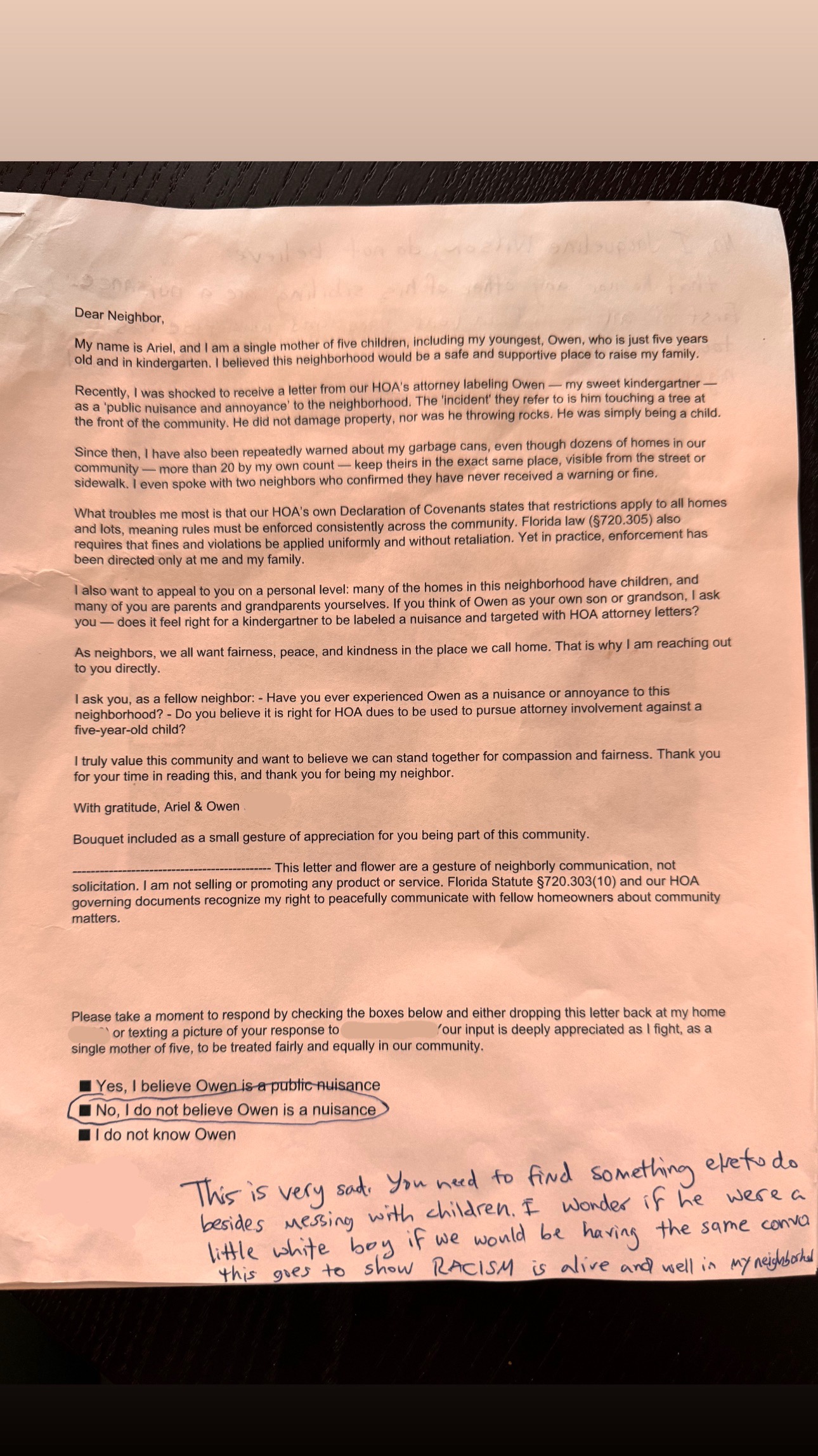 My 5-year-old son has been labeled a “public nuisance” by our HOA for simply touching a tree at the bus stop. Instead of compassion, we’ve been met with attorneys and legal threats. I’m a single mother fighting for fairness and my child’s dignity—please help us defend our rights thank you