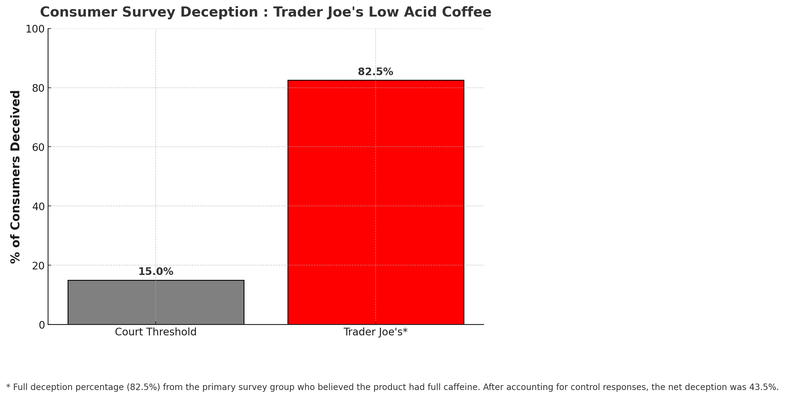 Over 70% of consumers said they would not purchase the product. Over 70% felt the labeling was misleading or fraudulent. Most believed “low acid” referred to roasting or bean treatment — not caffeine removal.