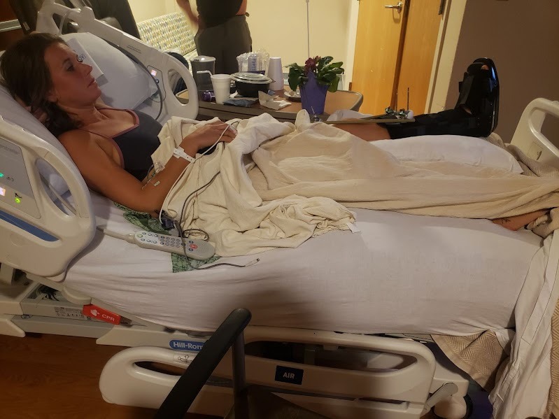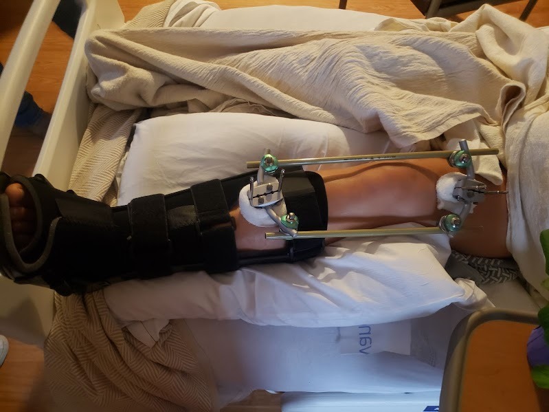 On Mother’s Day morning, Laura underwent surgery to stabilize her leg with metal pins and screws placed through the bone and connected to a stabilizing bar outside the skin. She is still in the hospital and will undergo a second surgery by the end of the week to insert internal plates to properly align and secure the broken bone.