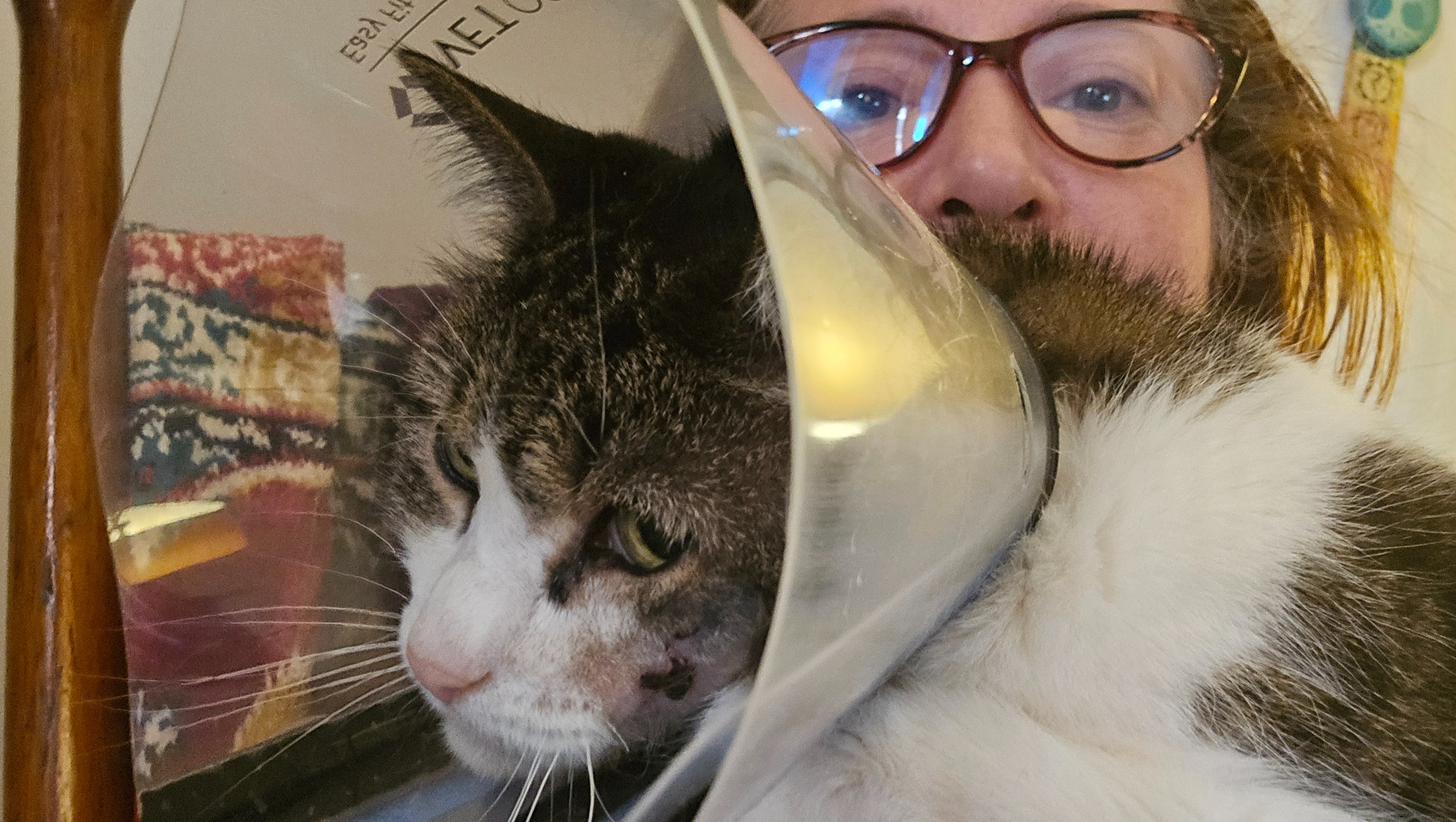 The spunky senior is not liking her cone, but we're so GRATEFUL to have her slowly getting back to her regular self. She has no teeth now, but she has found a way to head-butt her Mommy with her cone and then give "love nips" on my chin and nose. It's just all gums!