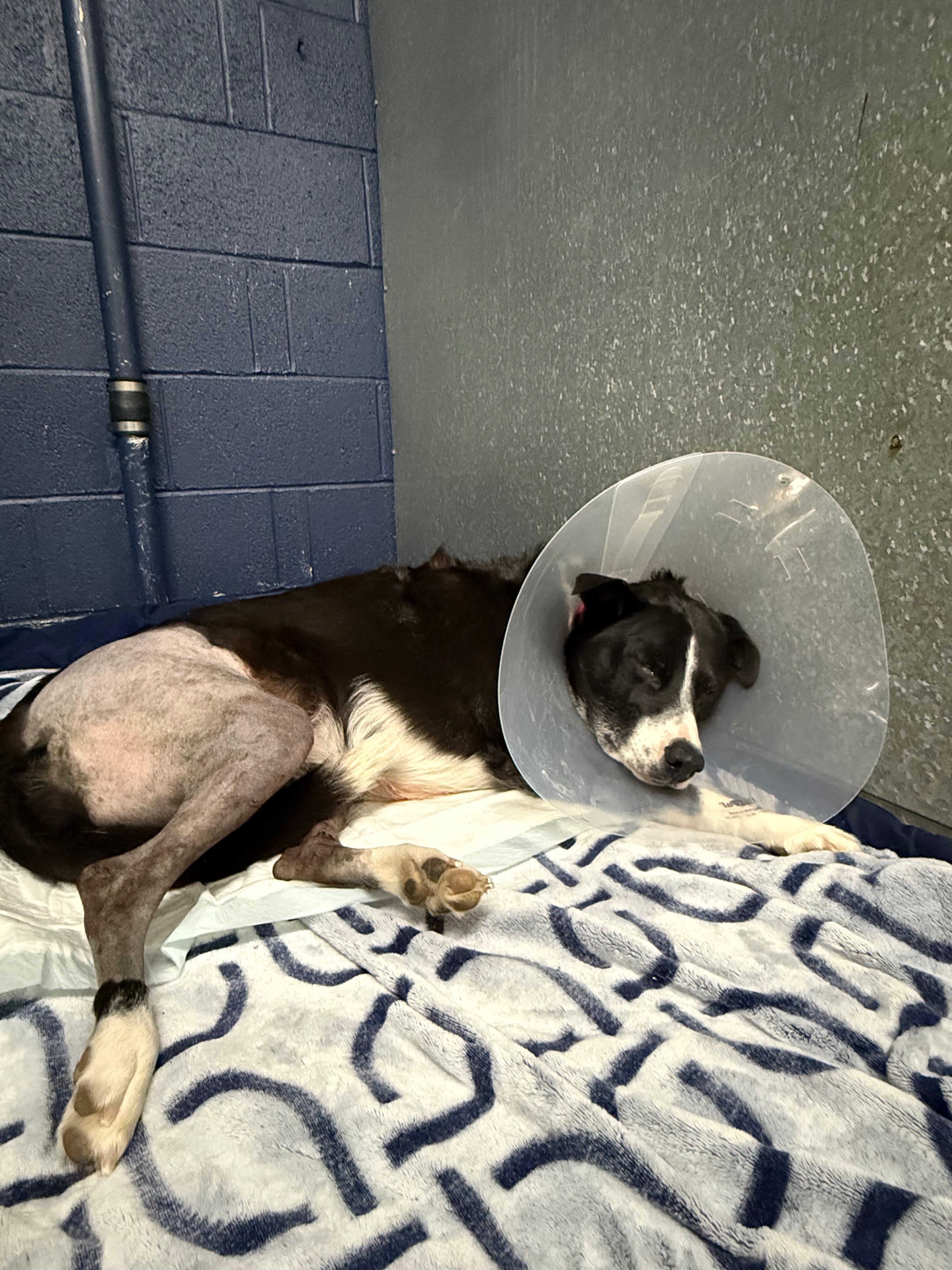 Hello, DOG (Dee-ooo-Gee) was diagnosed with two CCL tears in her hind legs the week before Christmas. She just went through a 4.5-hour-long surgery to perform a bilateral TPLO on her knees this Monday morning, the 29th. The TPLO surgery was to cut and rotate her joint in her knee to prevent the joint from thrusting out of place. Typically, this rotation is a 9-15° angle, with a severe case normally not exceeding 35°. DOG needed 43° on one side and 46° of rotation to prevent this joint from thrusting out of alignment. She is currently spending the next few days at the vet hospital recovering from surgery.