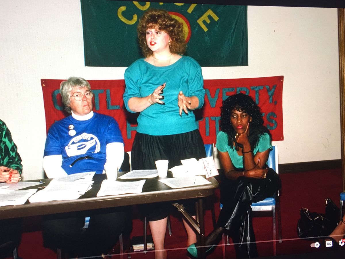 pictured above is Priscilla Alexander, Dolores French and Gloria Lockett from COYOTE sitting by a sign that says 'Outlaw Poverty not Prostitution' during the 1980s.