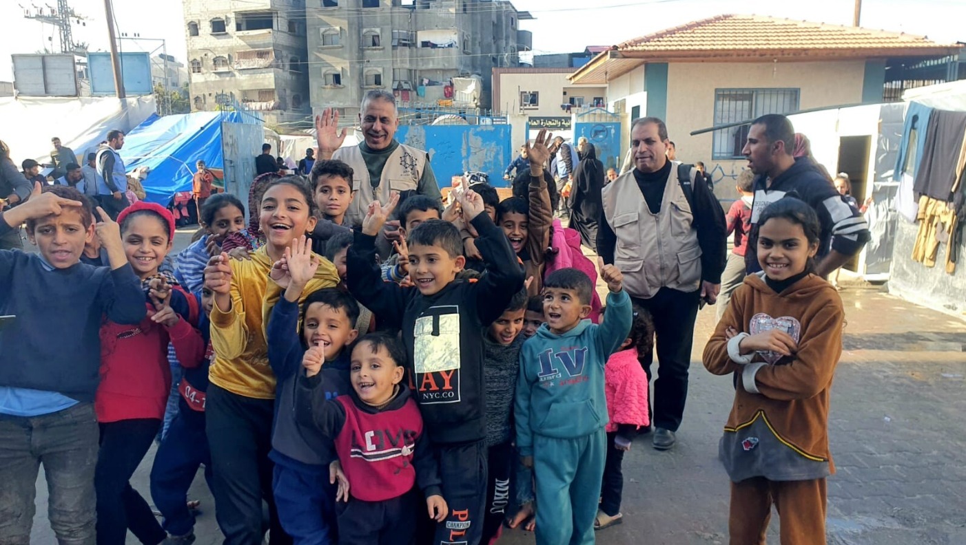 Jamil (center back) helping children release their fear and anxiety in an UNRWA shelter (November 2023)