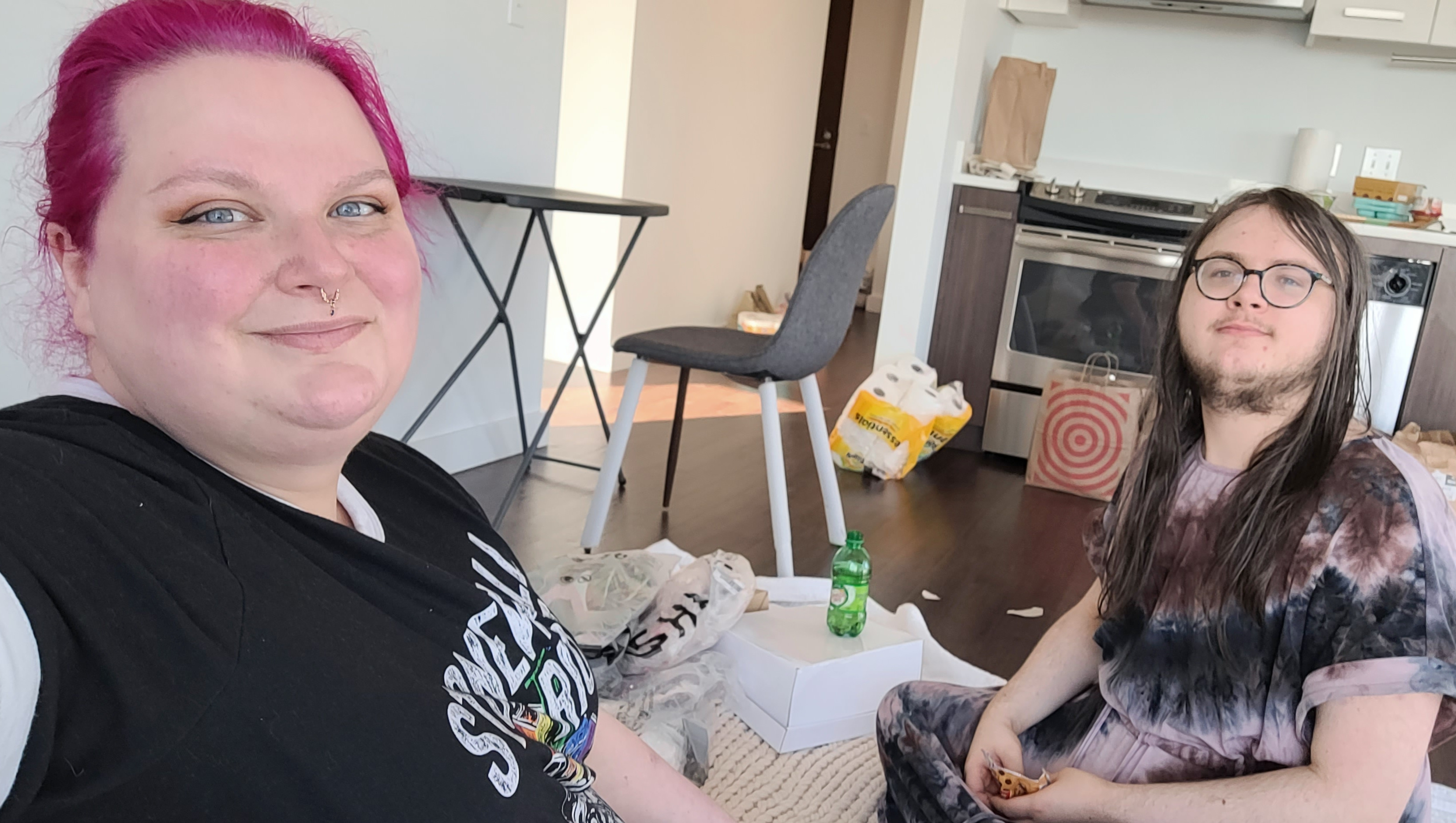 This is me and my kid, Caelan, on our first night in our new apartment in Portland, OR. My ex was packing the truck and driving from NC to OR, while Caelan and I flew ahead. For three weeks, we were really happy. It took three weeks for my ex to arrive with the truck.