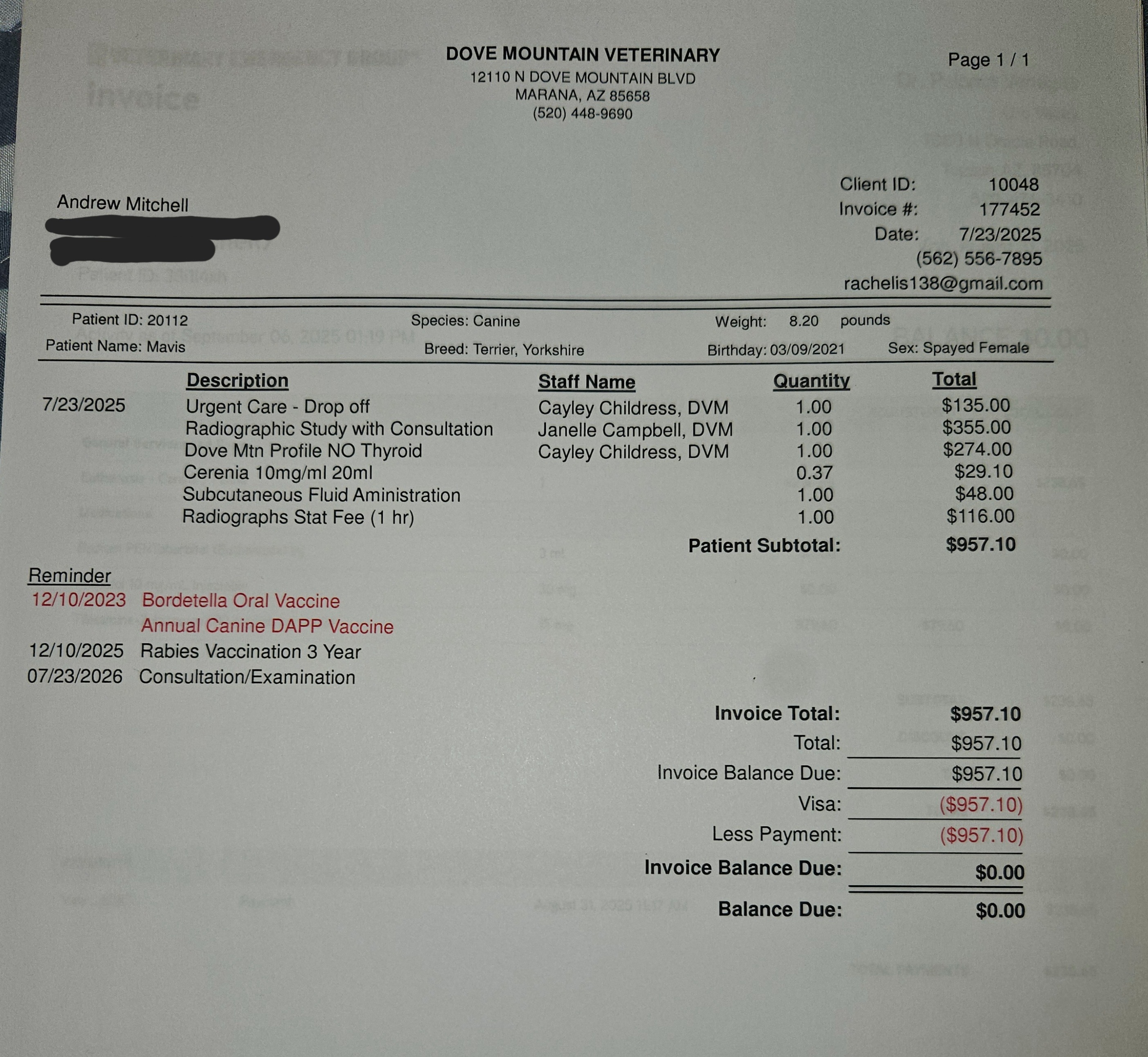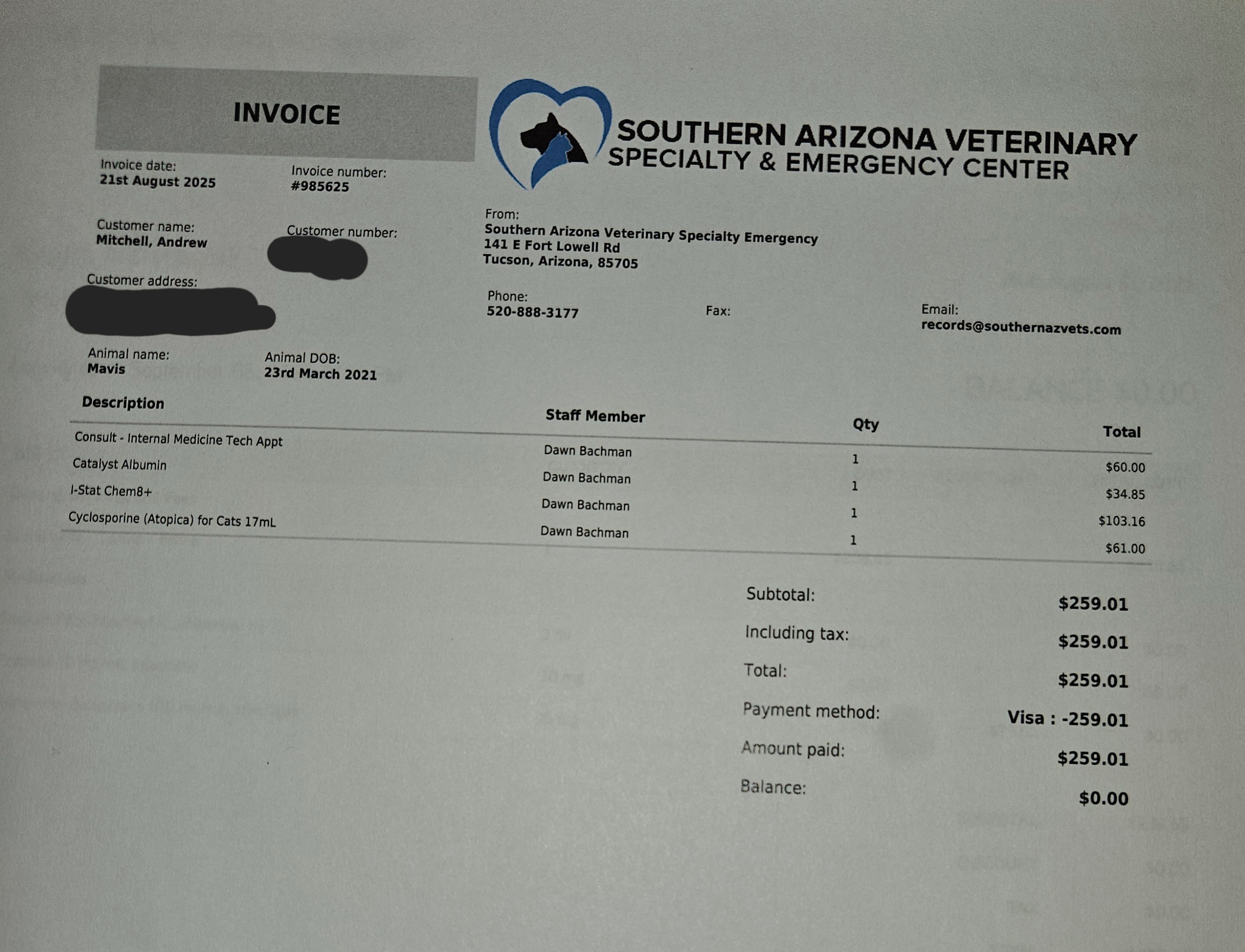 To say this experience has been traumatic for our little family would be an understatement. The house feels empty and quiet, and her little sister Mabel has been left confused without her lifelong companion. We have spent the last month grieving, but now the reality of our fight for Mavis is hitting us in the form of over $5,000 in vet bills. Having this debt hanging over us after having lost this battle and our baby is very much a salt in the wound feeling. I have included pictures of most of the invoices for her care and euthanasia.