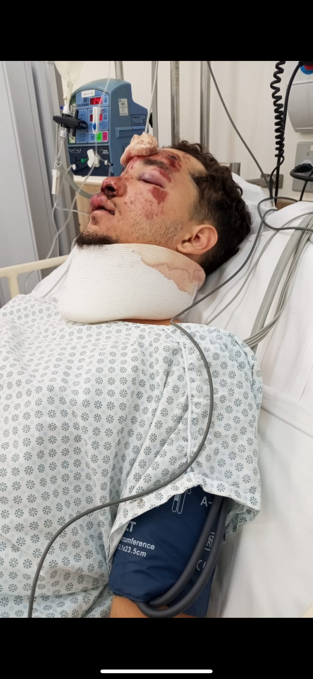 Eduardo suffered a traumatic brain injury, multiple fractures in his face, and three fractures in his cervical spine. He spent three days in the ICU and later went through a very delicate surgery that lasted nearly 14 hours, where plates and mesh had to be placed in his face. He now requires physiotherapy and ongoing medical care.