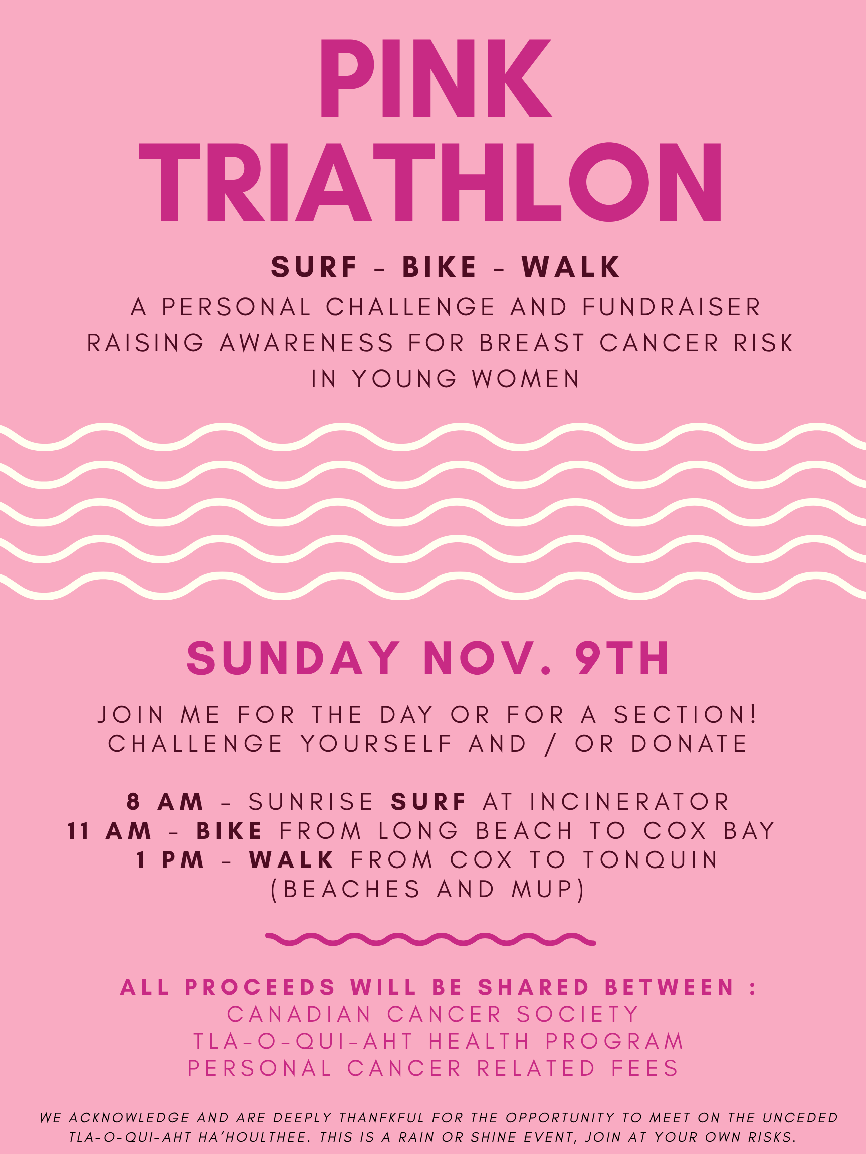 October is breast cancer awareness month, so let’s start with some basic facts. Only about 6 in a 100,000 women aged between 20-29 will get a breast cancer diagnosis (BCC 2024). That’s a 0.006 % chance, and this year, I’m one of them. My stage 2 triple-positive breast cancer means that I need to go through 6 rounds of chemo (if everything goes well) and years of hormonal therapy once that is done to prevent it from coming back. Losing my long hair, having to pause plans of progressing in my work, going through fertility concerns for my future, etc. Cancer is life-altering at any age, but in your 20s, you’d never think that’d be an issue. The major part of the treatment is taken care of by the healthcare system, but some medications have to be paid out of pocket and are costly. The money raised will be split between 3 causes: giving back to the Canadian Cancer Society to help other young women in my situation, supporting the Tla-o-qui-aht Health Program that help out people from Tofino (Načiks), and my own personal fund for cancer-related expenses. I am doing this fundraiser mainly in hopes of spreading the word about the reality of women under 40 getting diagnosed and encouraging them to carry out thorough self-exams because there’s always a risk. I am challenging myself to do a « triathlon », with a twist. In between treatments and surgeries, I’ll spend a day surfing, biking and walking to spread the word and encourage people to move, no matter their fitness level. Anybody is free to join and more info can be found on the poster. Rain or shine, I’ll be out there and hope that whoever can will join the challenge.