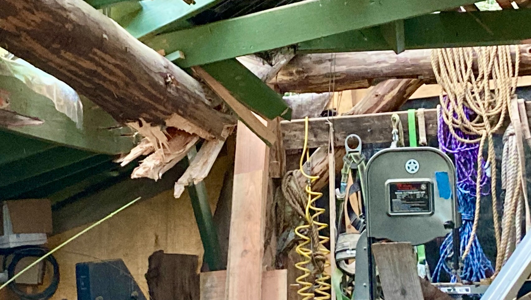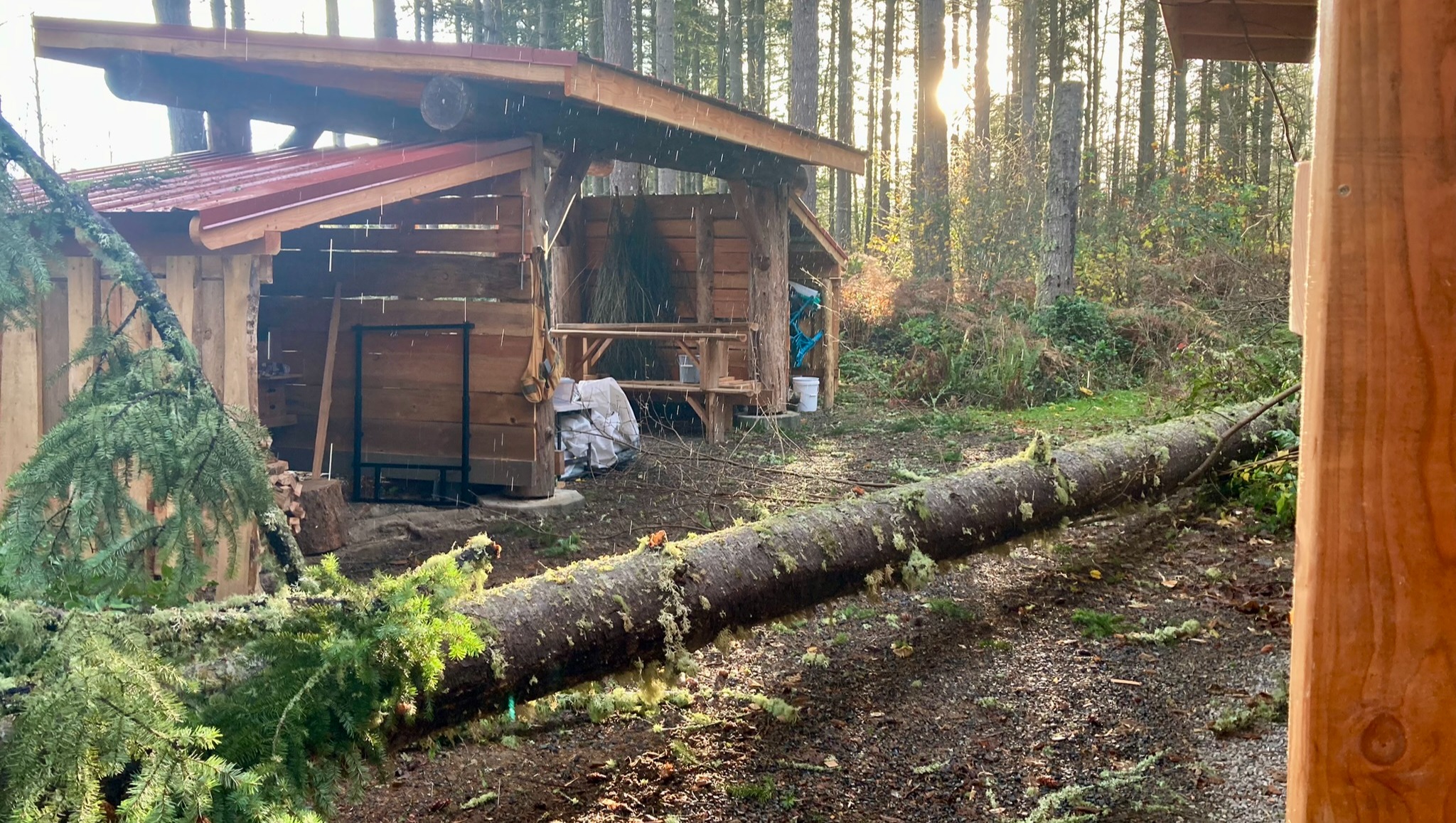 That wasn’t the end of the damage caused by this tree. It was so tall that, along with another tree, it hit and destroyed the roof of Jim’s workshop. With the roof and support posts compromised, Jim had to move his tools, temporarily storing them in a converted shipping container that normally provides housing for live-in volunteers. There is no room to work in the container, nor can it be lived in for the time being.