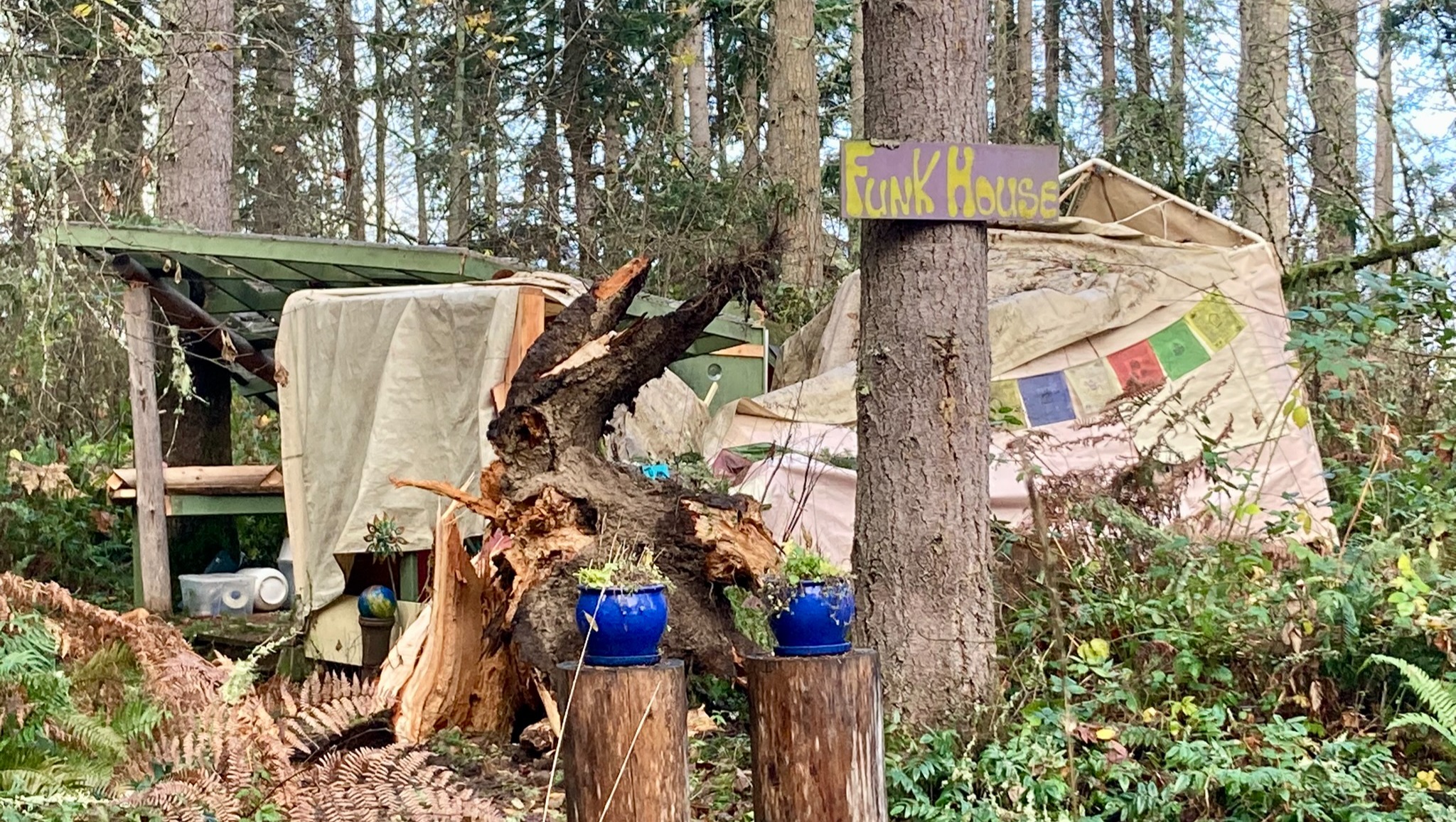 The smaller Funk House glampsite was obliterated by a very large fir tree. Cutting through the tent structure, it came to rest next to the bed. It also drove the base of a table on the deck through a plywood panel, collapsed the roof structure over the outdoor kitchen, and crushed the outdoor bathroom.