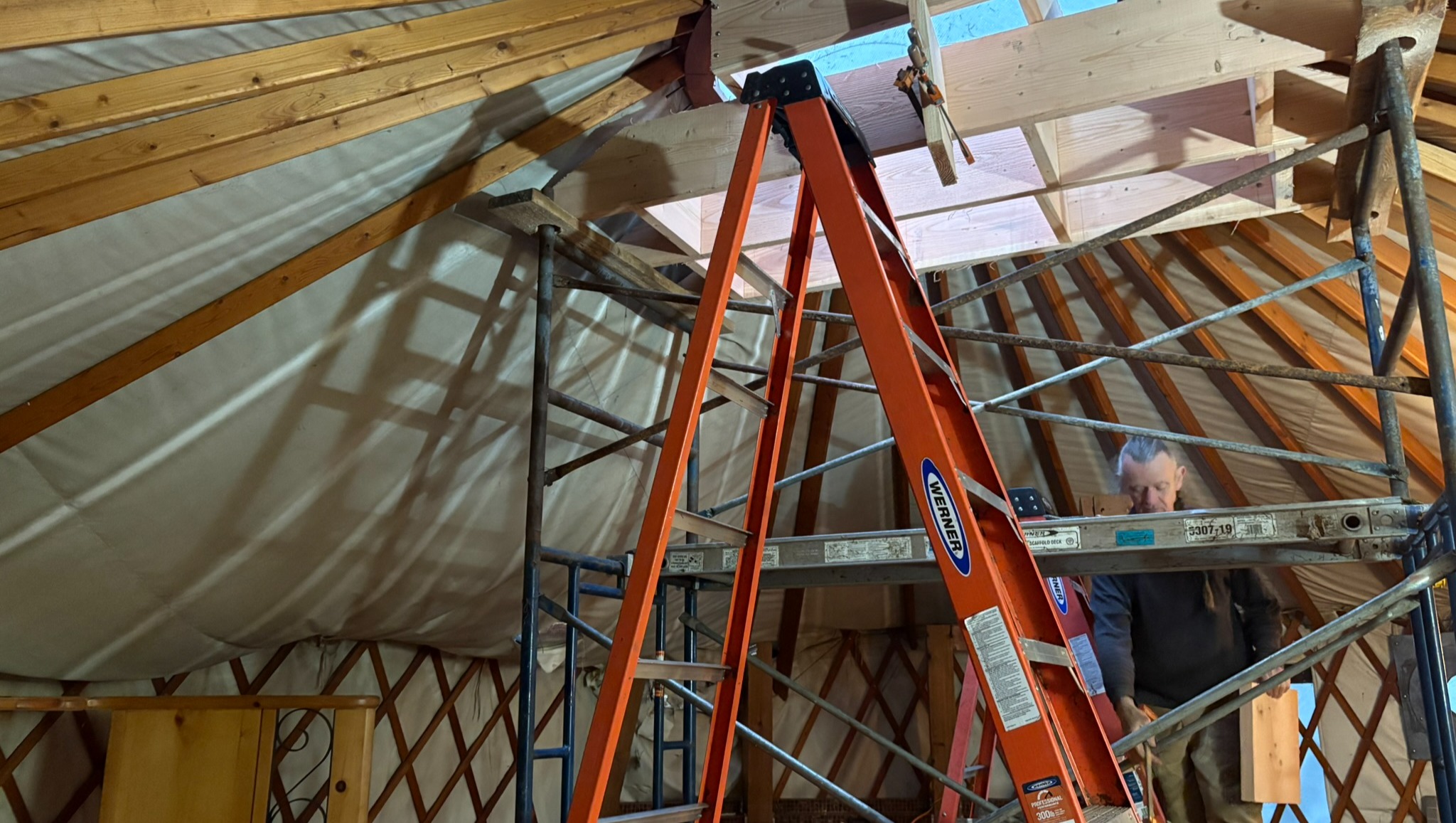This will keep the yurt standing until the repairs are complete. Replacements for the outer roof canvas and the skylight dome have been ordered.