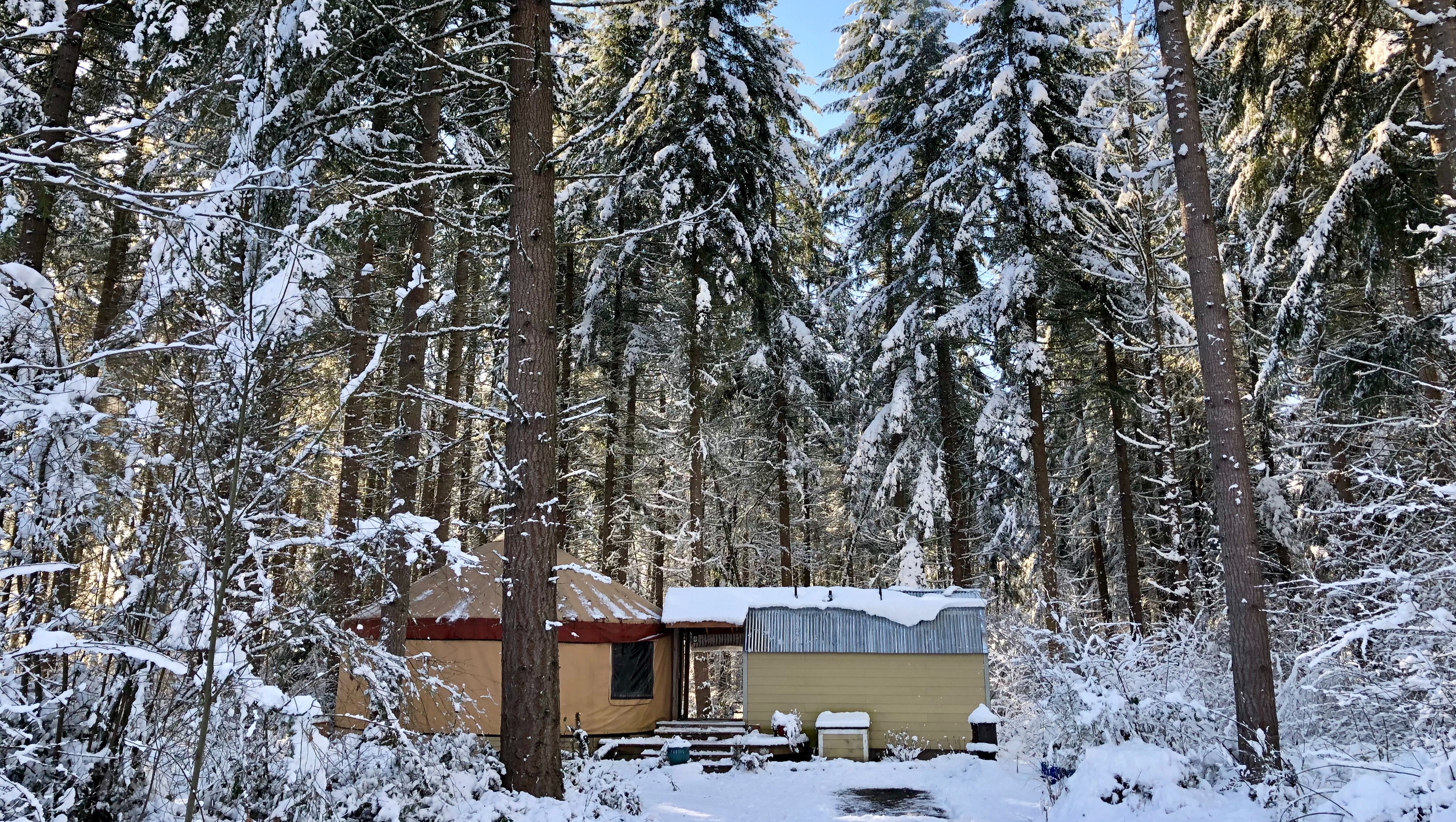 A fir tree came down during the night, striking the yurt. It broke 12 of the yurt’s 42 rafters, and a branch punched through the yurt’s lining. The kitchen area was left exposed to the elements, interior items were damaged, and the entire structure was left in danger of collapse.