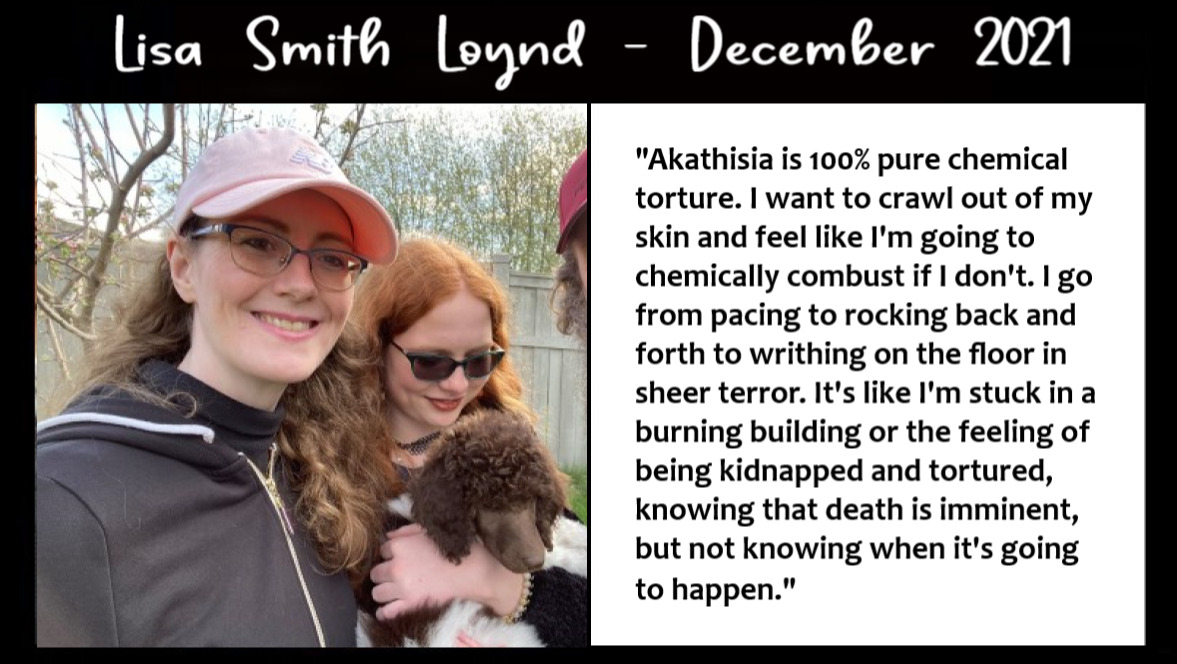 The Akathisia Alliance for Education and Research nonprofit organization was formed by people who met in an online support group. Since March of 2021, we have lost at least 10 friends to suicide, including Marly, Mark, Lisa, Mona, Kathleen, and Karen. These people did not end their lives because they were depressed – they simply could not bear the torture any longer.