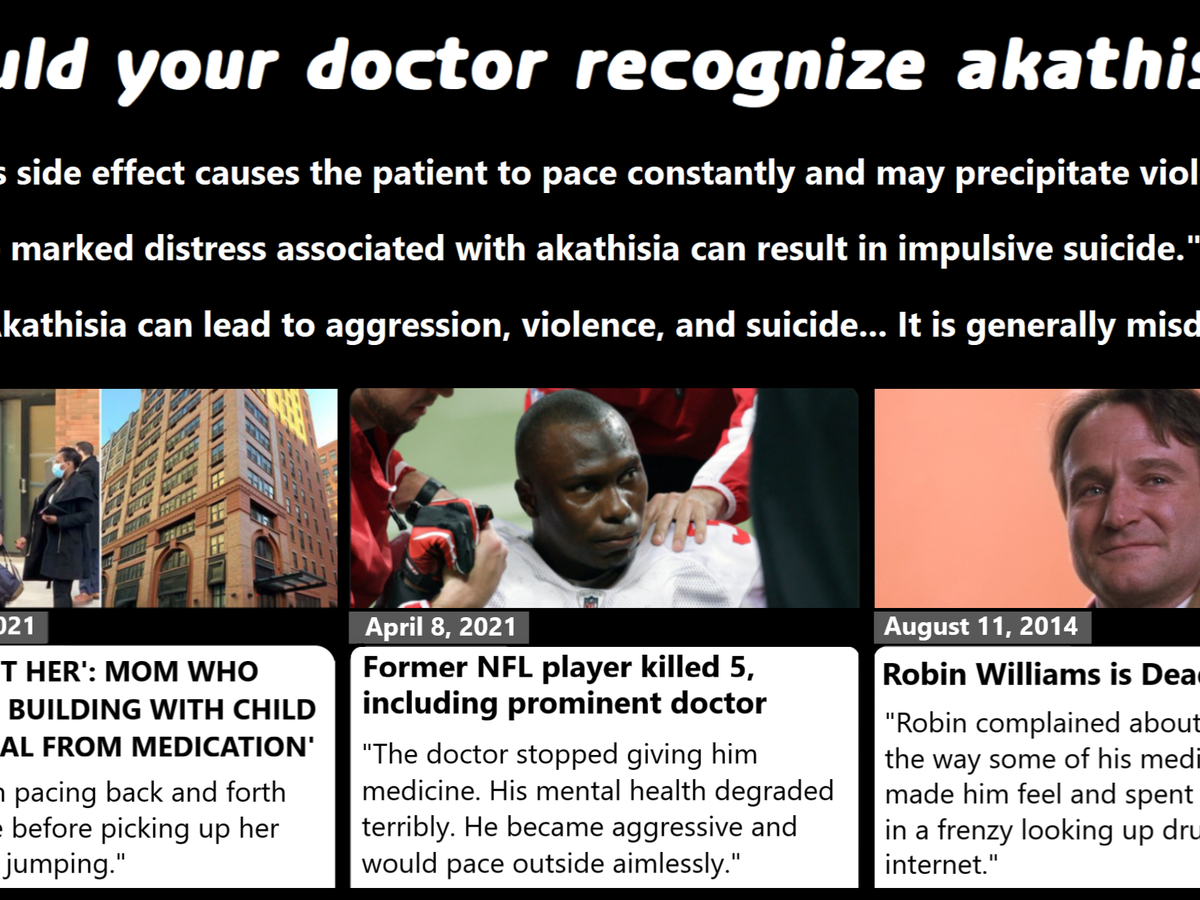 Right now, all over the world, people with unrecognized akathisia are being restrained and force-drugged with the very medication that caused it – a method used by the Soviet Union to torture prisoners. Others who were already on the brink of suicide due to akathisia have also lost everything and everyone they had to live for because they could not get a doctor to diagnose it. For some, years of mistreatment due to misdiagnosis has significantly compounded their akathisia-induced aggression and homicidal impulses – and this could prove to be a fatal combination that could take many lives.