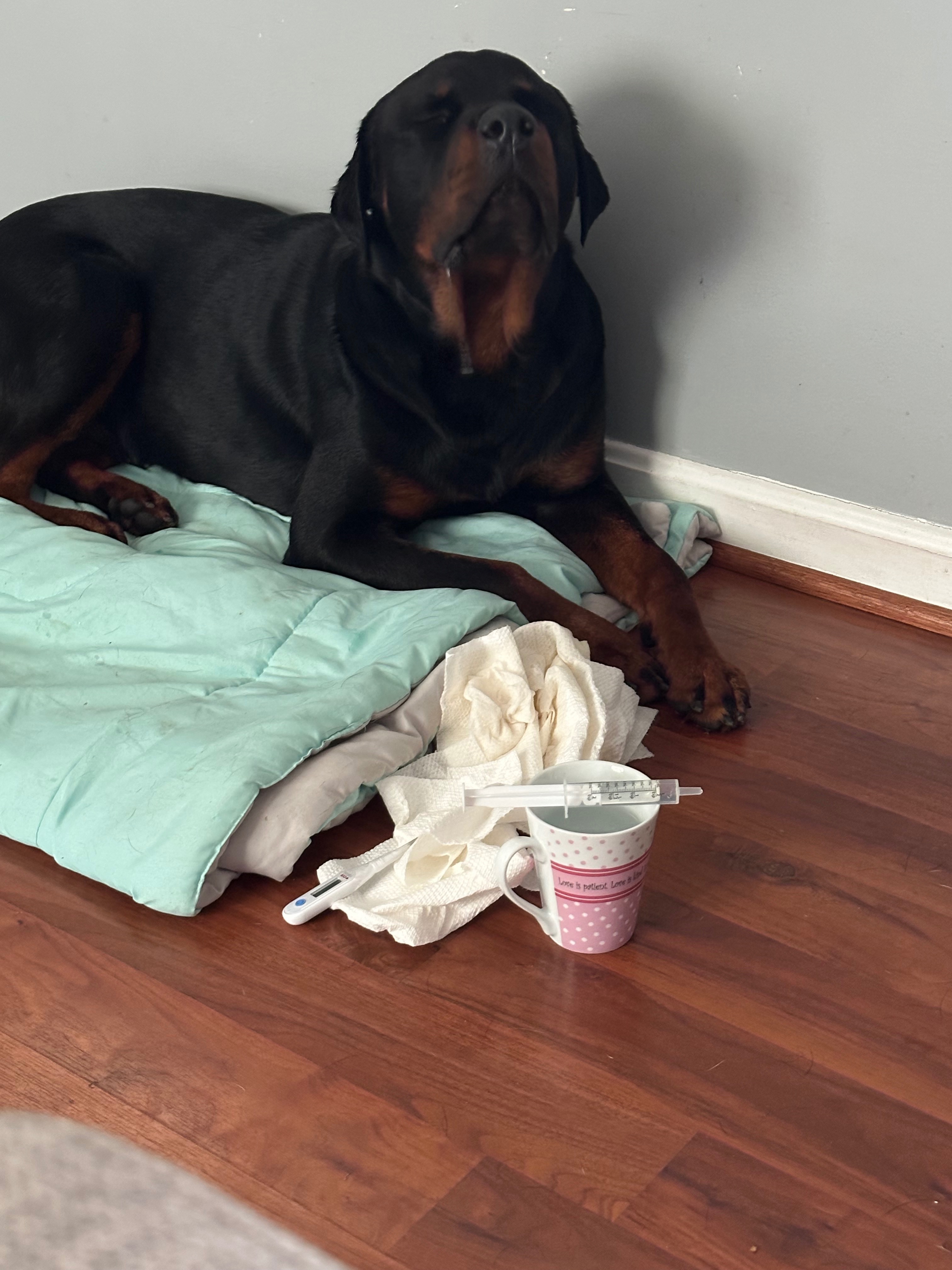 8/11- 7am, I get up to get ready for work, give out dog meds and make chicken and rice- Enzo leans on my leg, I can feel that he is hotter than he should be. Temp check reveals 105°. Immediate cool shower and fans to try and bring it back down. Yeti has no appetite.