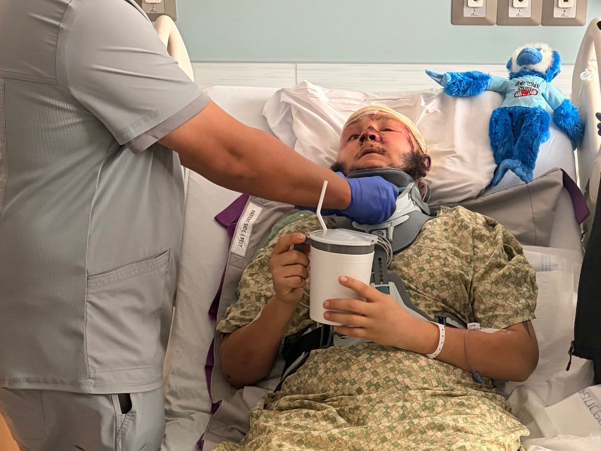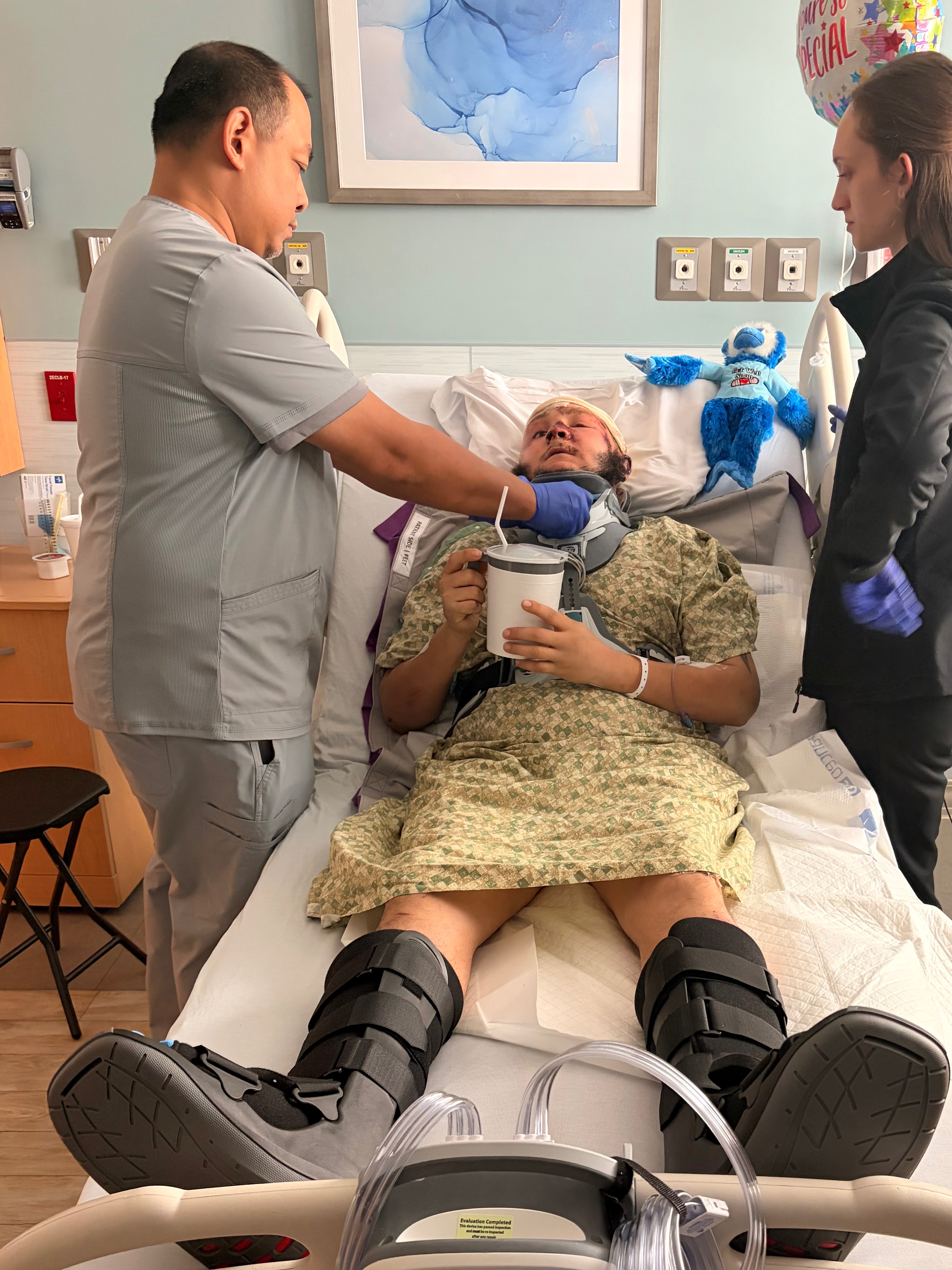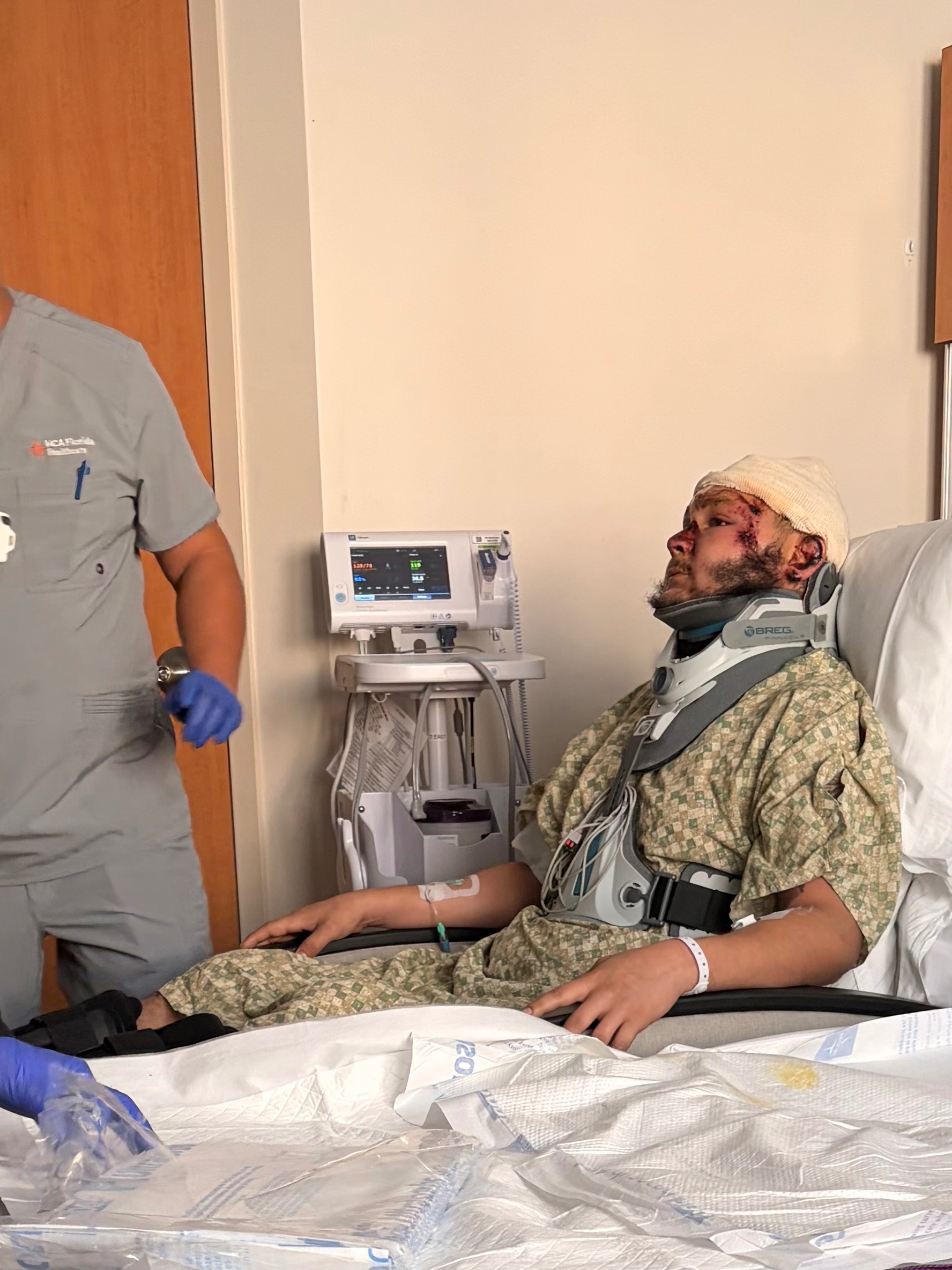 Eric suffered a spine injury, a severe scalp laceration that required reattachment, a broken right leg, a fractured left knee, a fractured rib, and a neck fracture. He was airlifted to the HCA Orange Park Trauma Center in Jacksonville, where he faces a long and difficult recovery. Despite everything, Eric’s sense of humor and gentle spirit still shine through, even during his brief moments of wakefulness in the hospital.