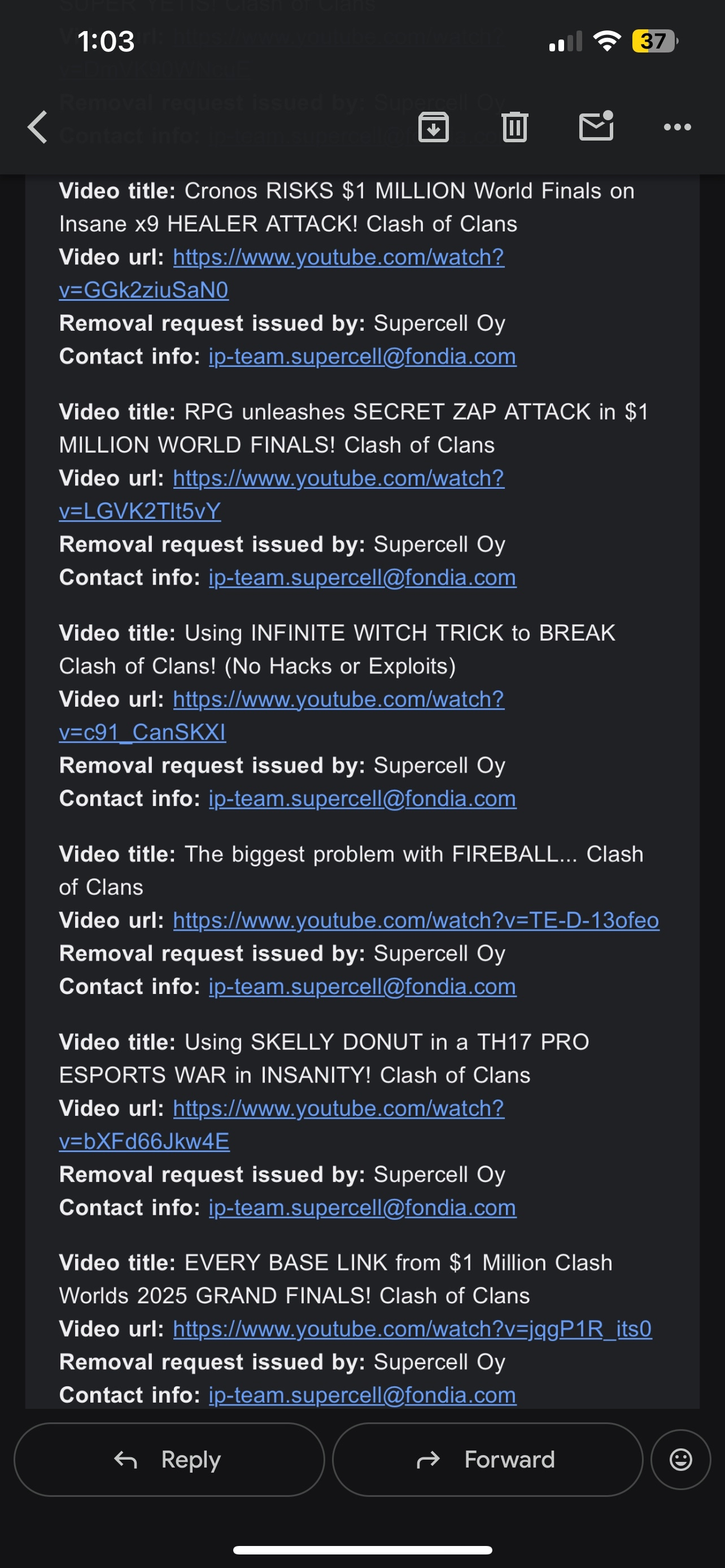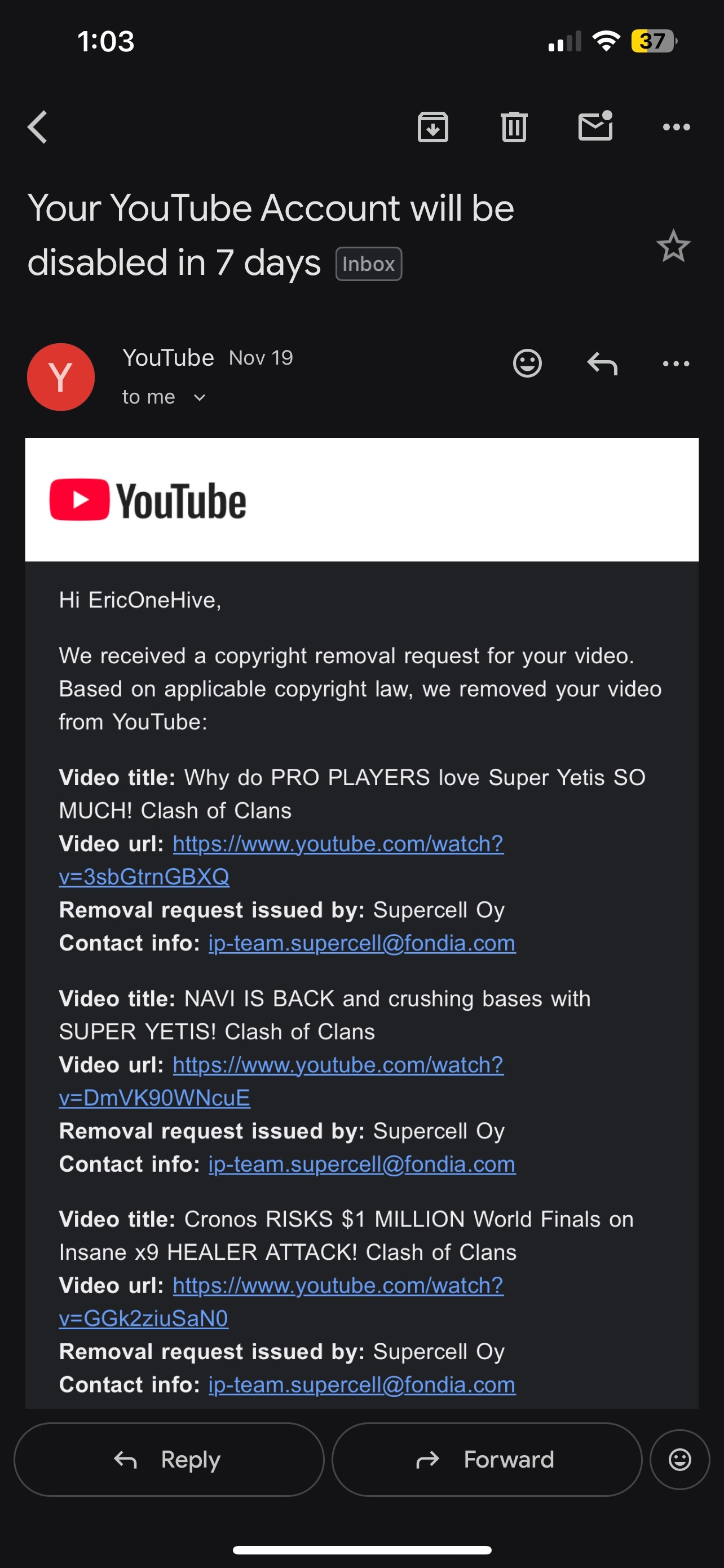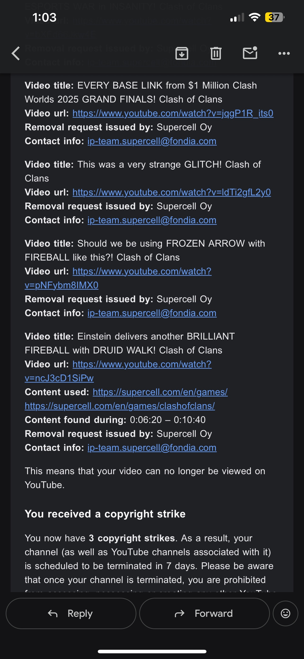 On November 18th/19th, Supercell Oy placed 11 Copyright Takedowns on my channel which resulted in the 3 Strikes required to PERMANENTLY DELETE the entire channel. (see attached pictures for the email from Supercell that states the reason for the takedowns/strikes)
