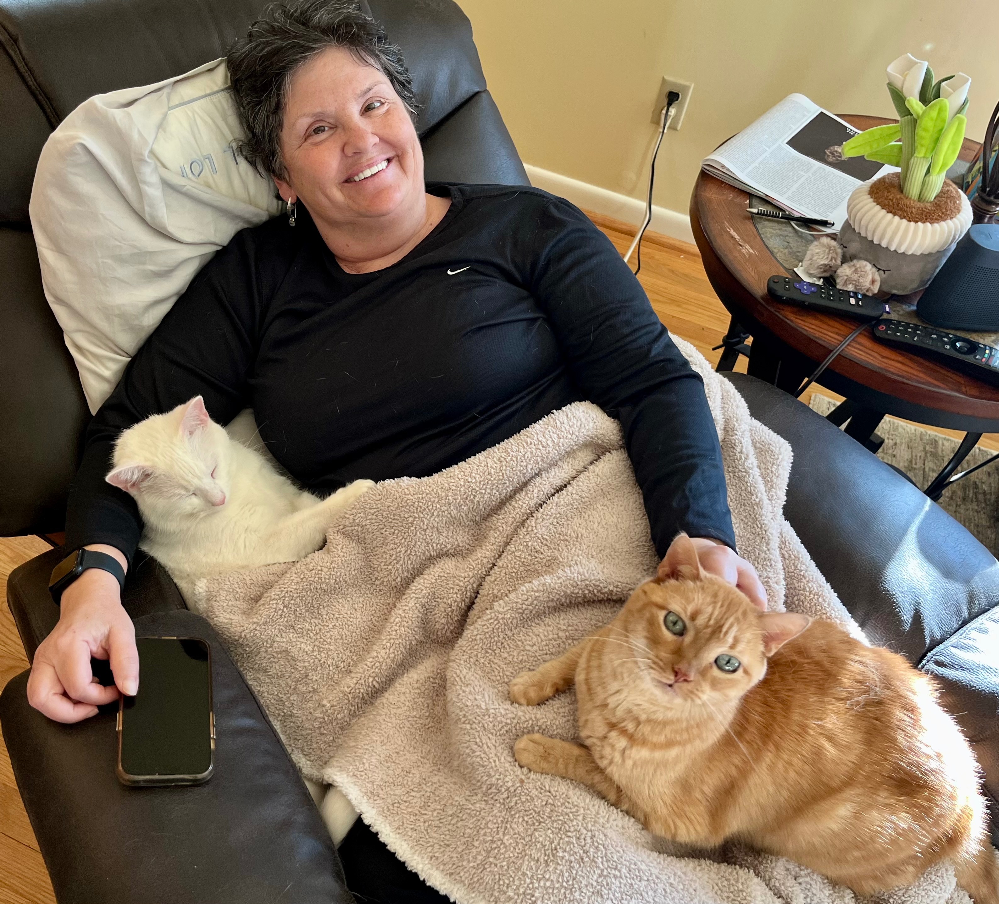 It’s been a struggle, but her husband, Eric, has remained steadfastly by her side, going to every appointment with her, staying in the hospital with her, scheduling her many medications, getting up in the middle of every night to make sure she takes them properly, cooking meals, and taking care of all of the necessary household chores.
