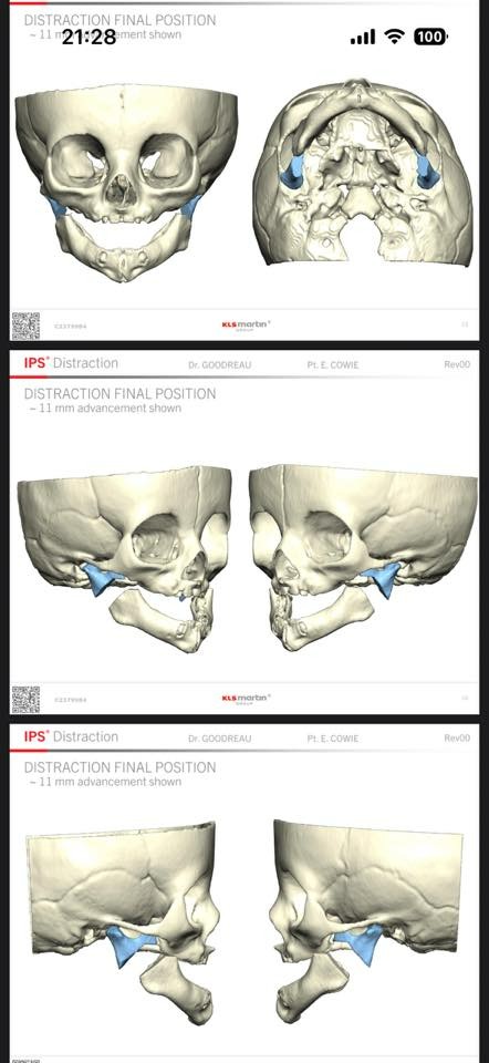 Surgery will be December 8th. The plan is to cut/break her jaw and use titanium brackets that were 3D printed from her CT scans; they should mold perfectly to her jaw. They will have pins on the end of the brackets that come out behind her ears that will have to be turned multiple times a day to slowly elongate her jaw.