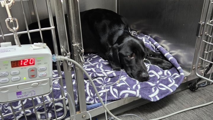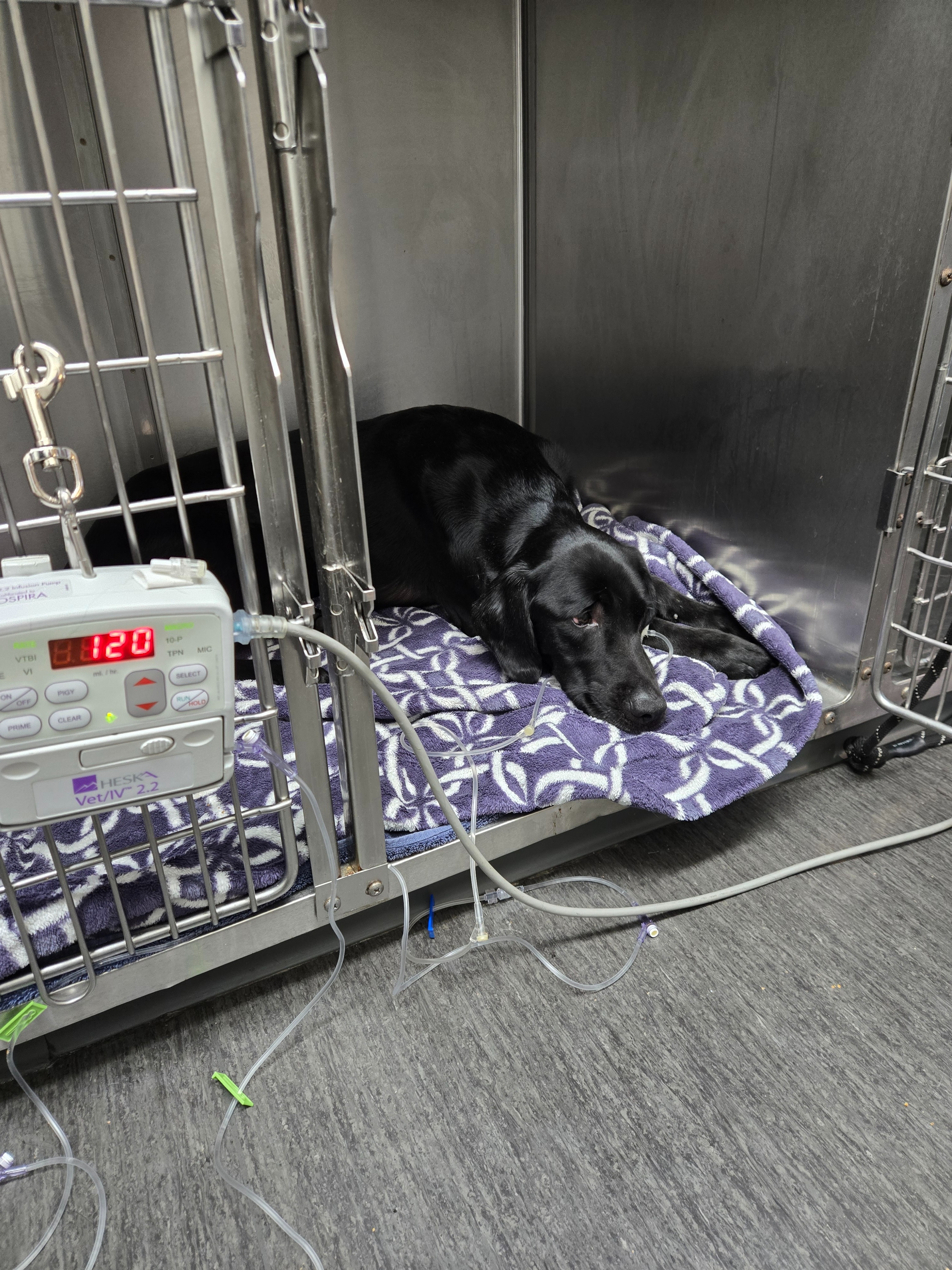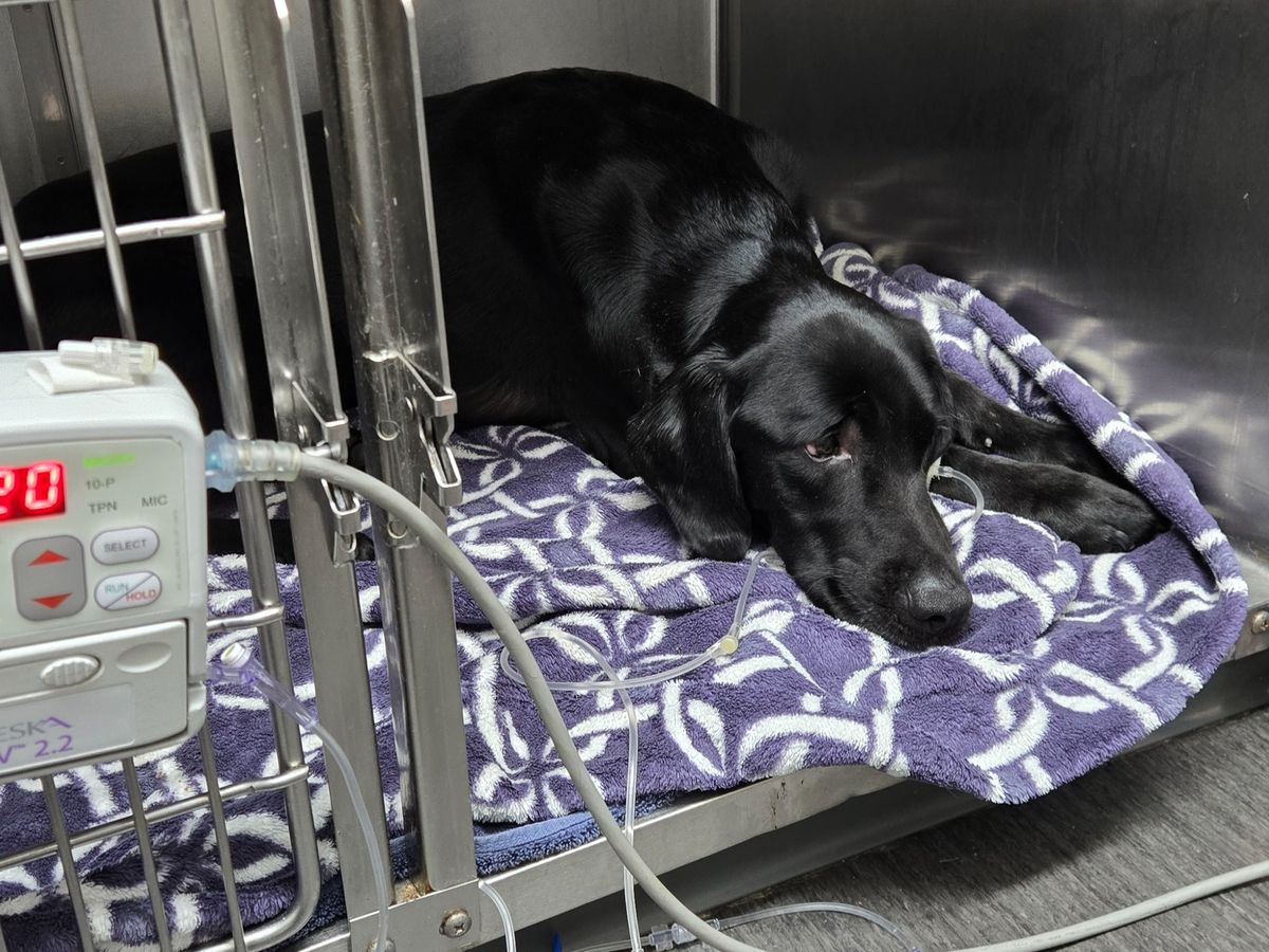On Wednesday 10/8, Ezrah was admitted to the emergency room with a severe case of pneumonia. He spent four nights in the hospital, receiving intensive care including IV fluid therapy, IV antibiotics, nebulization therapy with coupage, chest and abdominal radiographs, ultrasound scans, a canine respiratory disease PCR panel, pancreatitis test, and comprehensive bloodwork. The medical team worked tirelessly to stabilize him and provide the best possible treatment.