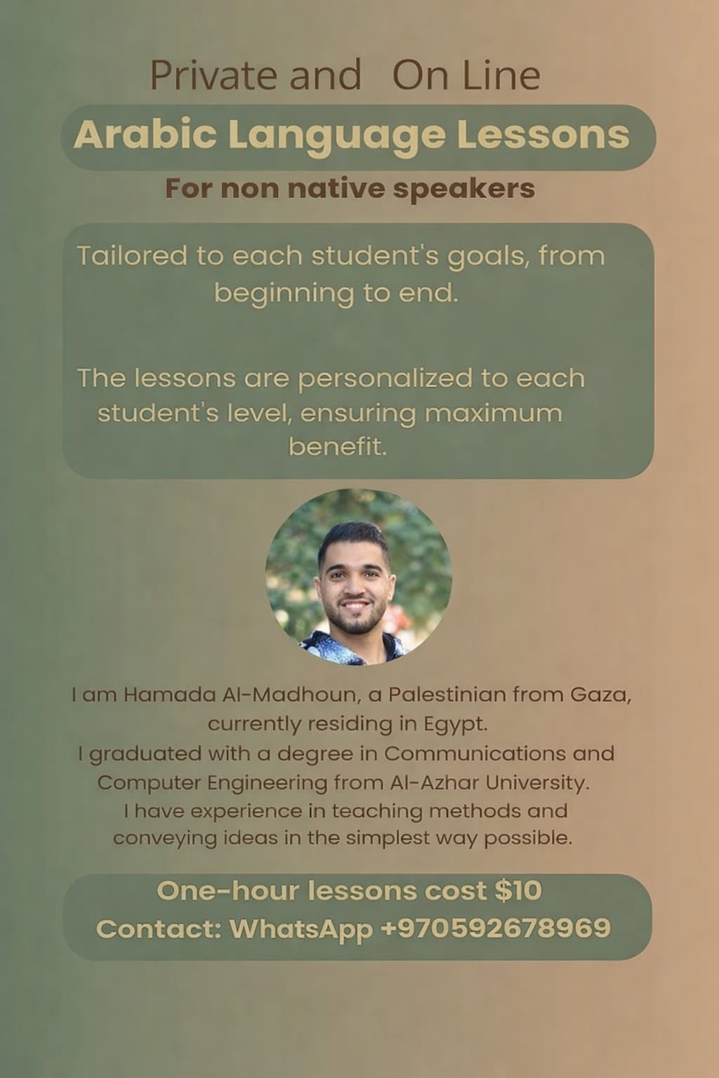 For my part, I'm also trying to work through Arabic lessons online. If anyone wants to learn Arabic, I'll be there for each student in the lecture so they can benefit as much as possible. The contact is in the images attached.