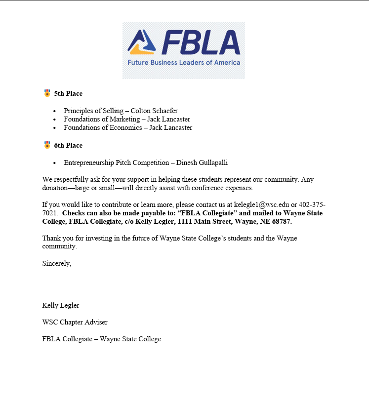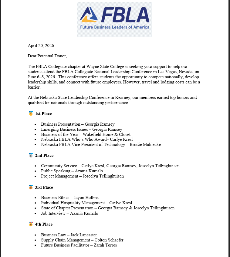 The FBLA Collegiate group at Wayne State College has earned the opportunity to attend the National Leadership Conference, a milestone that means so much to all of us. This event is a chance for our group to grow, learn, and connect with other aspiring leaders from across the country. However, the costs of travel—including, Ubers, food, and other essentials—are more than we can manage on our own. We want every member to be able to participate, regardless of their financial situation, so we’re reaching out for support.