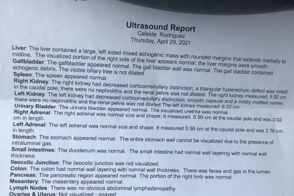 The following week Celeste was doing okay and I anxiously waited for her results. On 4/28, of course when I was out of the state in Florida, I was informed that her tests from the week before came back unequivocal and that she would now need imaging at a specialized center. They made a recommendation to a facility to use. I immediately coordinated this from Florida and was able to schedule her an appointment for an ultrasound the following day at Bluepearl Pet Hospital in Queens. On 4/29 Katie took off from work and took her to the facility first thing in the morning so they can do an ultrasound of her abdomen so they can see what's going on. Katie called me about 1-2 hours later and the news destroyed my heart.