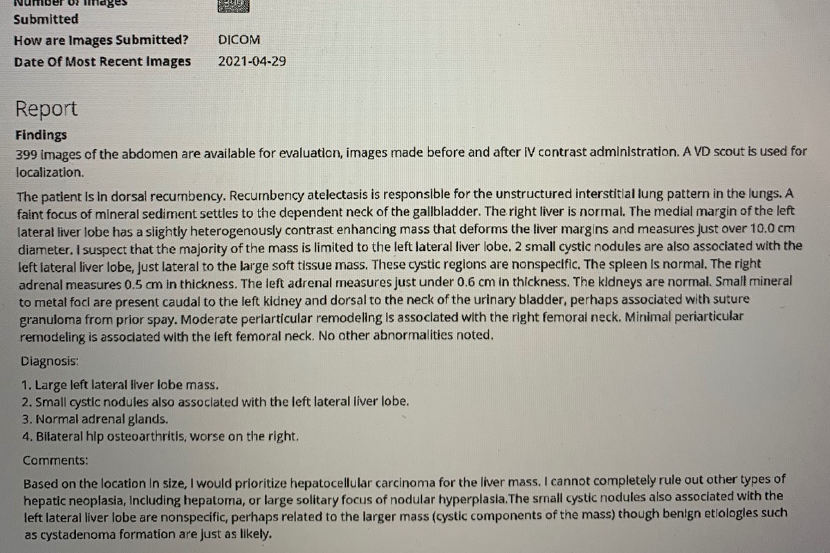 Celeste was found to have a large left sided liver tumor r/o hepatocellular carcinoma (HCC). I felt an immediate crushing pain that went through my very soul. Working in the medical field you sometimes can't help but think about worse case scenarios and this was the worse case scenario. These results were immediately relayed to Celeste's primary team. After a long discussion with her team we agreed that Celeste needed further imaging and that she would need it quickly. I was told that the cat scan is going to lead me in the decision on how aggressively they want to treat Celeste. If there were signs that this tumor was localized we would do one approach and act aggressively. If it looks like the tumor was inoperable or there were signs of metastasis or spreading then we may have to go towards a palliative/comfort approach. Hearing this very frank discussion is what every pet owner doesn't want to hear. The thought of losing my pup, my best friend destroyed me and I couldn't help but cry. They again recommended several facilities they use for what would now be a cat scan of her abdomen. After what felt like a million phone calls, I was able to coordinate an appointment that same very day in the afternoon for Celeste to get her imaging. Katie was able to take her right away, this time to Atlantic Coast NY Veterinary Specialist. Katie told me that they would have to sedate her and that they would inject a dye to highlight the vessels and organs in her belly. Celeste tolerated the procedure well and after she recovered from anesthesia, Katie was able to pick her up and take her home.