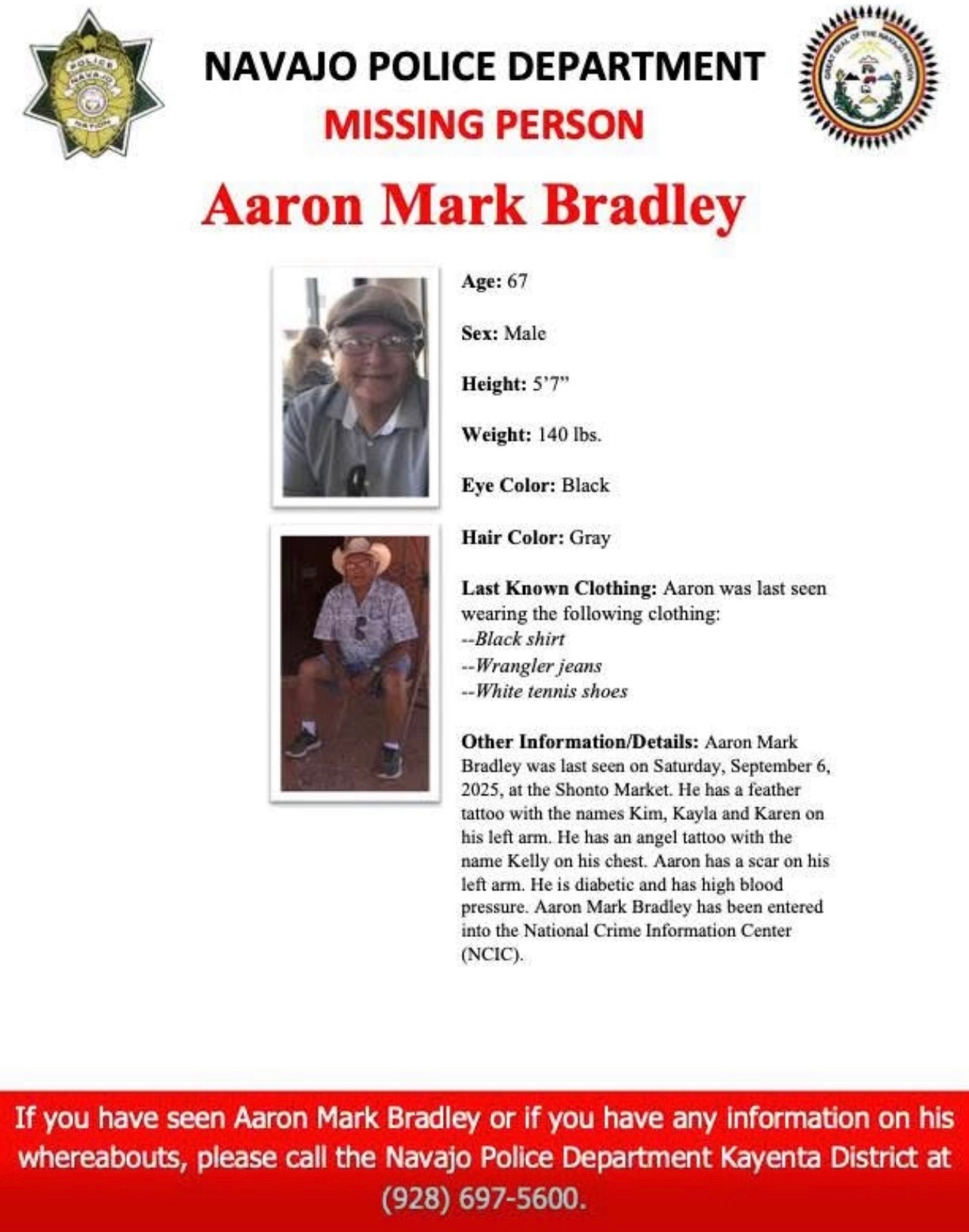 Aaron is a Navajo Elder from Cow Springs, AZ on Navajo Nation. He went missing on September 6, 2025, last seen at Shonto Market Place in Shonto, AZ. Aaron’s children continue the daily search for their father and keep the faith he will be found.