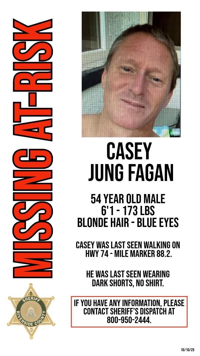 Casey was reported missing to the Riverside County Sheriff Office (RSO) by his girlfriend at around 11:00 am on 10/8/25. It appears that the Deputy who took the report did not take it seriously, did not make any inquiries into his whereabouts, left off duty for 4 days and did not pass the case onto anyone else. My family was not made aware of his disappearance until Thursday afternoon 10/9/25 when his girlfriend was able to get in contact with us. Since that time, I was on the phone constantly to RSO trying to get someone to search for Casey and ping his phone and look at that dangerous stretch of HWY 74. I finally convinced a Deputy at RSO on Friday 10/10/25 of the concerning circumstances of his disappearance and he was able to get an investigation team on his case. That is when they finally learned of the accident that occurred on the early morning of 10/8/25 and learned of the witnesses' account of his last known whereabouts. They did a helicopter search of the area that Friday night. They then deployed a search party on Saturday morning 10/11/25. This included about 15 people on the ground and 3 cadaver dogs. I was told that bloodhounds were not an option any longer as too many days had passed. The search party covered several miles and concluded that afternoon without finding him or any clues. It is important to note that the terrain out there is incredibly treacherous - it is rocky with steep inclines and covered with cholla plants - making it difficult and dangerous for anyone other than skilled professionals to search. On Tuesday 10/14/25, RSO conducted a drone search and covered a vast area. They were unable to find him or any clue to his whereabouts. The Sergeant at RSO confirmed they will not be conducting any more searches and will only be following up on leads/tips from now on.