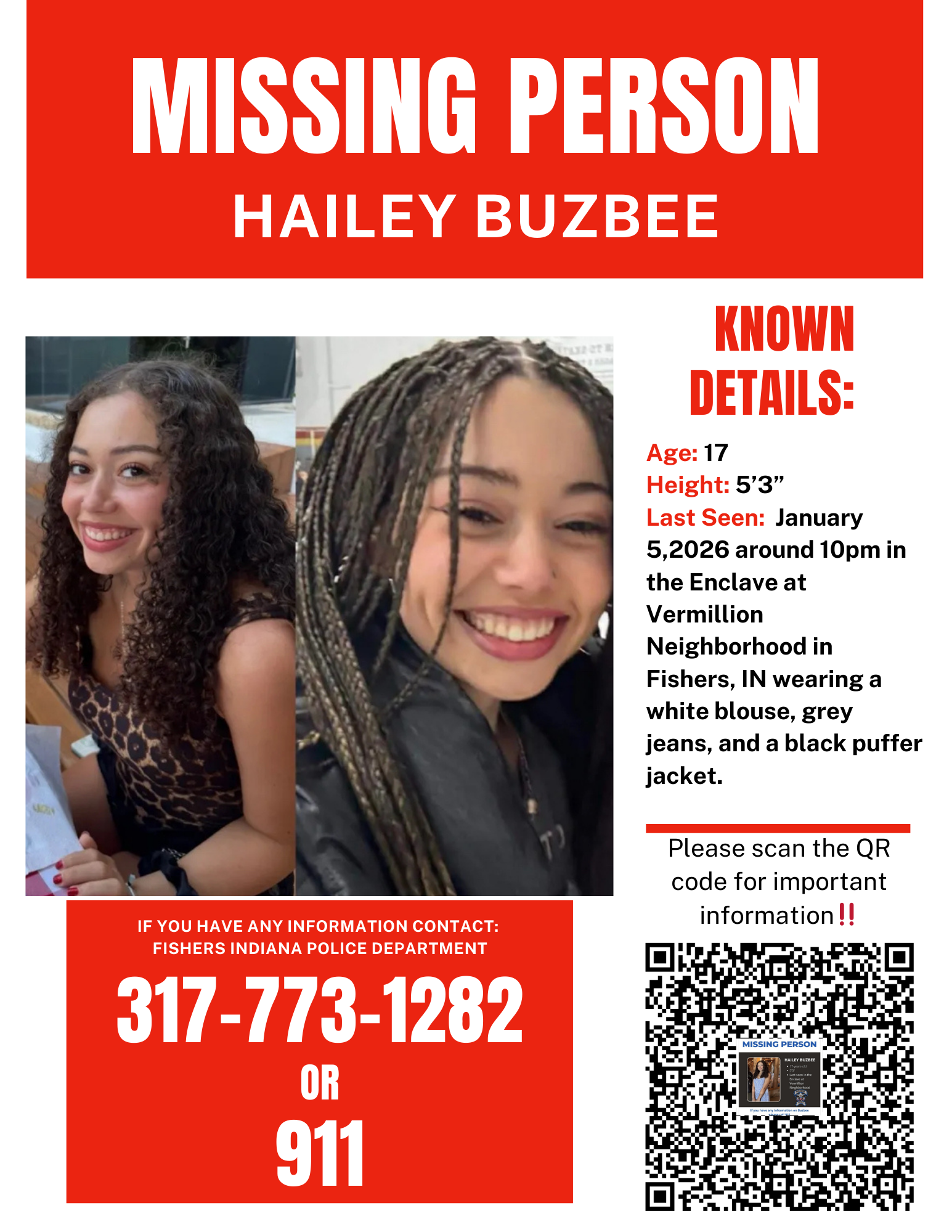 Hailey Buzbee is 17 years old, smart, funny, and beautiful inside and out. Everyone who knows Hailey will tell you she is the kindest, sweetest girl, and her beautiful smile can light up anyone’s day. On Monday, January 5th, 2026, Hailey was last seen at home around 10pm. We believe she left in the early hours of Tuesday, January 6th, and we suspect someone may be assisting her. We are deeply concerned for her safety and believe she may be in danger.
