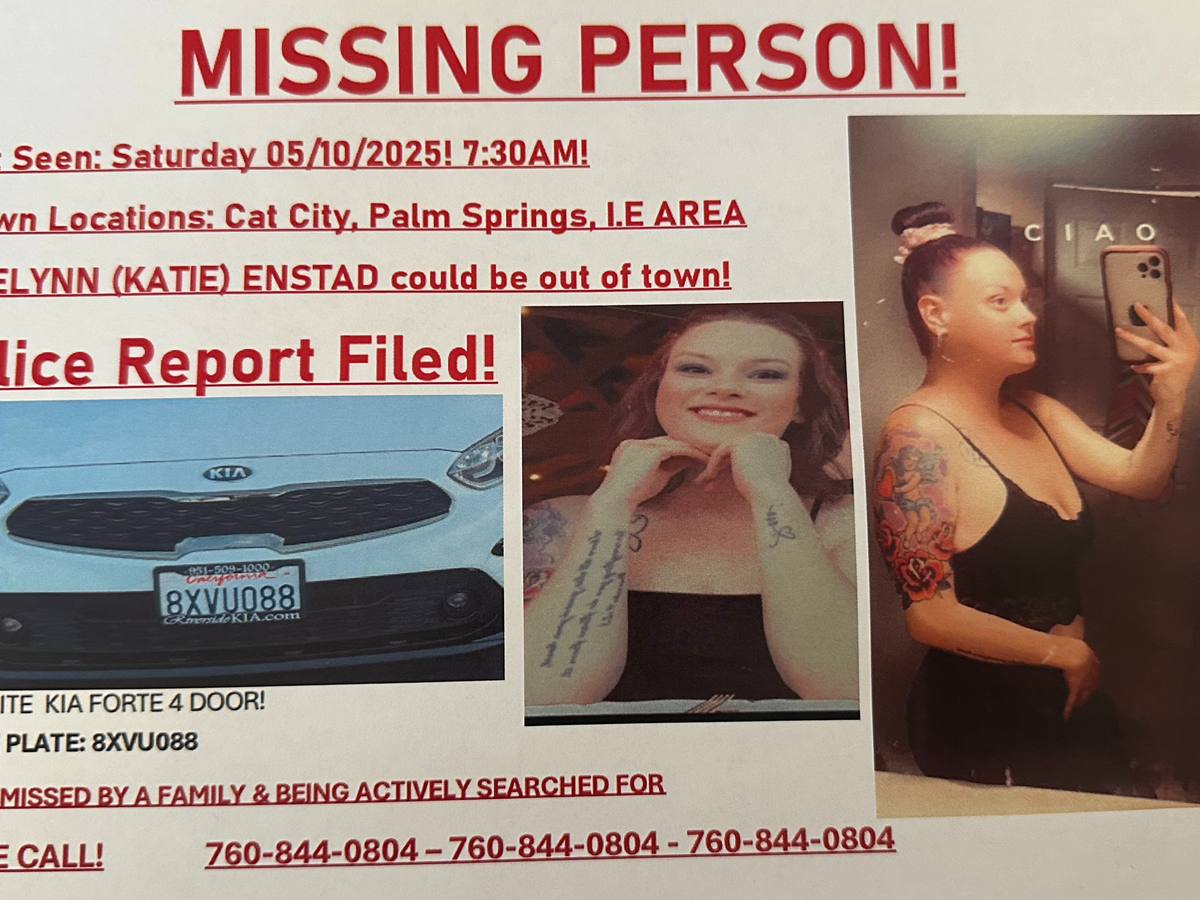 My Daughter Katelynn Enstad has gone missing, and we are deeply concerned for her safety. She was last seen on [05/10/25] in [Cathedral City] and has not been heard from since. She is [5 feet 8 in, 140lbs , has multiple tattoos on her chest and arms. see pictures]. We are urging anyone who may have seen her or has any information to come forward. Her disappearance is completely out of character, and we are doing everything we can to find her. If you have any details that could help, please contact [Or call the Cathedral Police Department or her sister Bryanna]. We just want her to return home safely.