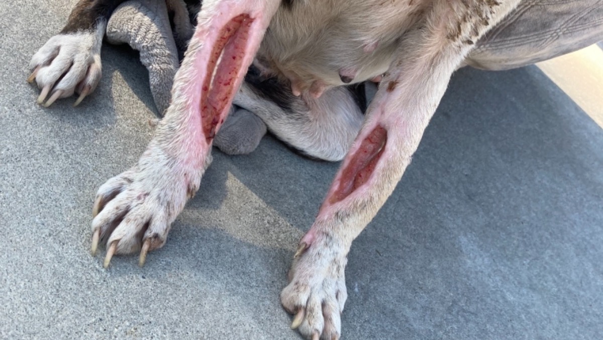 As we were driving on highway 140 we noticed a dog crate on the side of the road. We turned back and approached the crate as we saw something inside moving. We then started to approach the crate and noticed a dog inside that was badly hurt. Her front legs seemed like they were lacerated to the bone. We approached the dog and saw that she was very malnourished to where you can see her ribs and spine. The depth of the injury seemed like it was way more than we can handle. We rushed her to the Emergency Room.