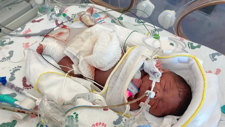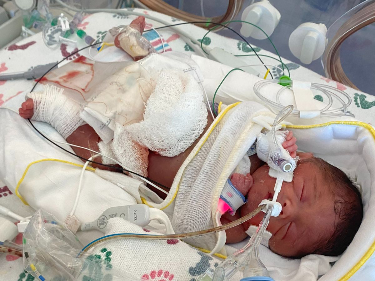 Victoria was born from an emergency c-section at 4am on 5/30/23, and has been such a fighter ever since. During the first week of life the doctors discovered that she had a Stage 4 brain bleed on the right side of her brain (the most severe form of brain bleeds). Her lungs weren't developed enough to breathe on her own, so the doctors switched her breathing machine from a ventilator to a heavy duty oscillator that breathes for her. At the end of the first week, she developed a serious infection in her stomach that the doctors hoped would go away on its own.