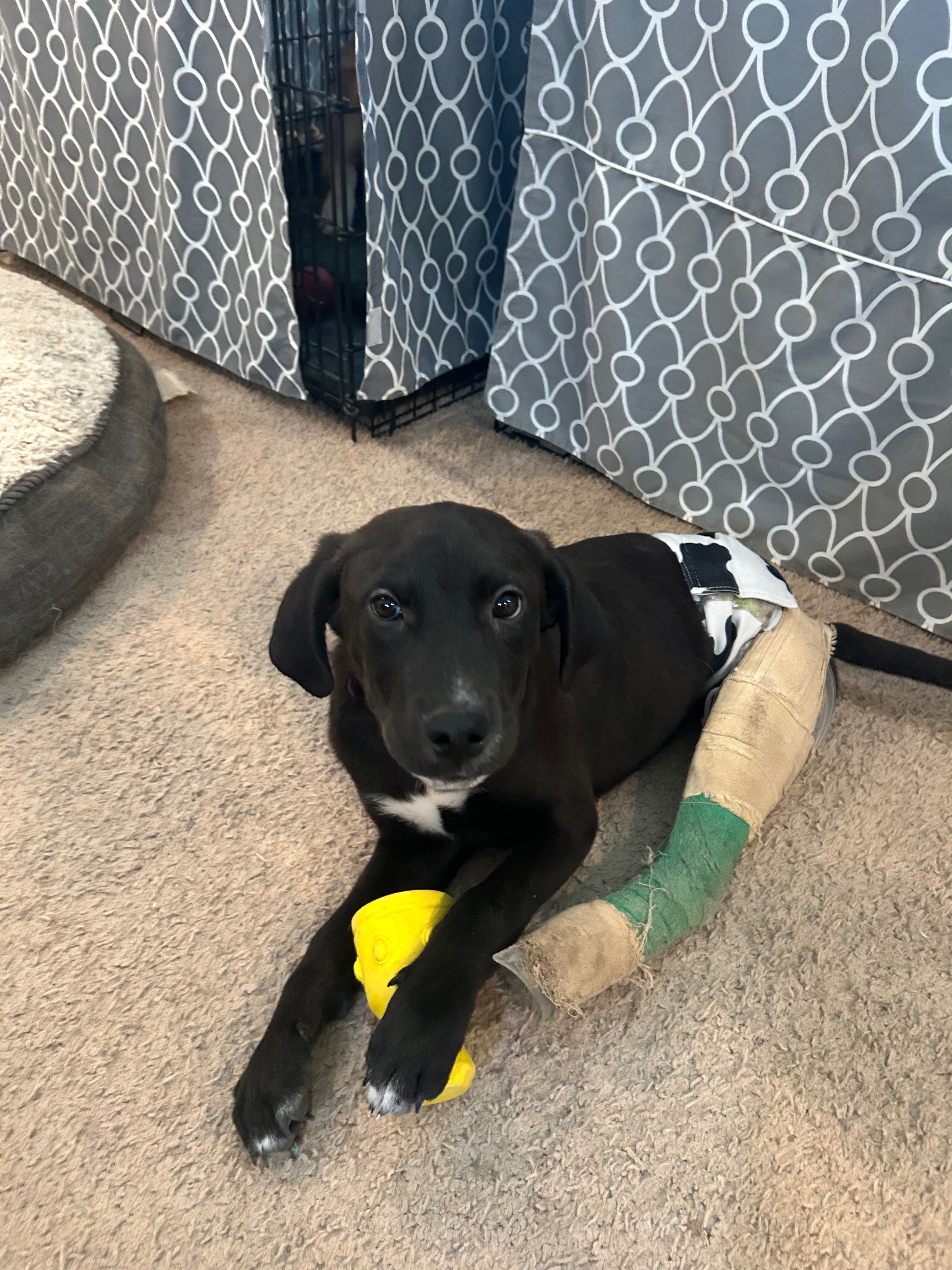 We started fostering Forrest at 12 weeks old after both his legs were broken and he was left alone after being hit by a car. He had casts for 6 weeks while his bones healed. Unfortunately, both of his back legs have remaining issues which impact his mobility. One leg needs to be amputated and the other has a luxating patella which will require surgery before the worse leg can be amputated. He is a good candidate for surgery, but we are trying to raise some of the funds to cover his surgery and physical therapy costs so that we can get his legs fixed up and then find his forever home.